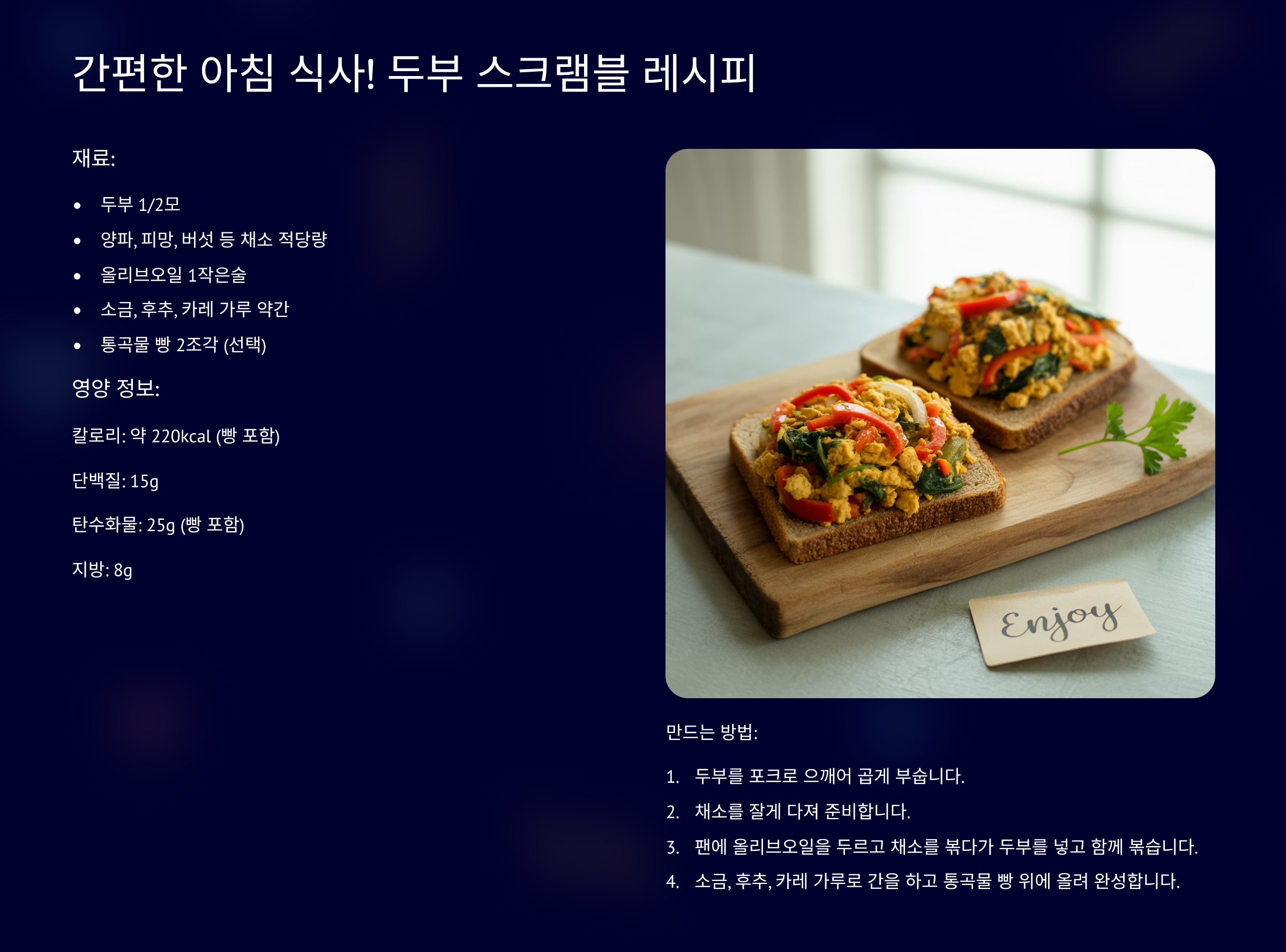 두부 스크램블은 먼저 두부의 물기를 살짝 제거한 뒤 포크나 손으로 으깨줍니다. 양파, 파프리카, 당근 등 채소는 잘게 다져 준비합니다. 팬에 식물성 오일을 두르고 다진 채소를 볶다가, 으깬 두부를 넣고 함께 볶습니다. 두부가 살짝 노릇해지면 소금과 후추로 간을 맞춰주고, 계란 스크램블처럼 몽글몽글하게 볶아주면 완성! 통밀빵이나 샐러드와 함께 곁들이면 더욱 완벽한 다이어트 아침 식사가 됩니다.