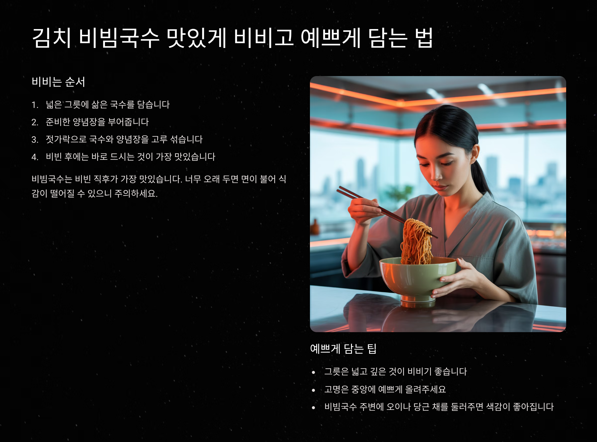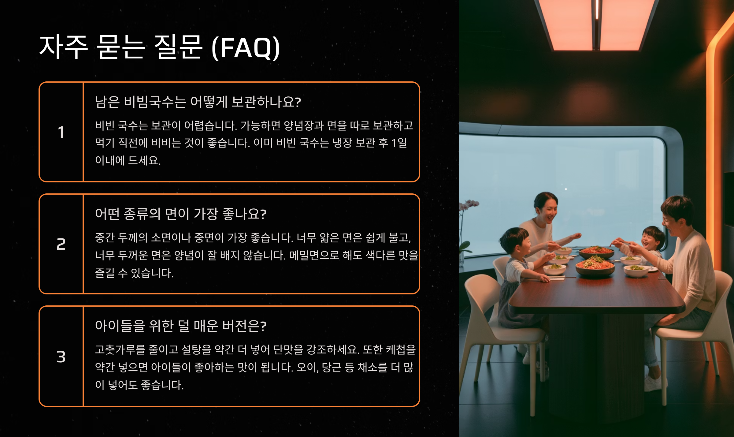 | 맛있게 비비기 | 손으로 면을 살살 풀어주며 고루 비비기 (양념이 잘 스며들도록) | 너무 세게 비비면 면이 끊어질 수 있음 |