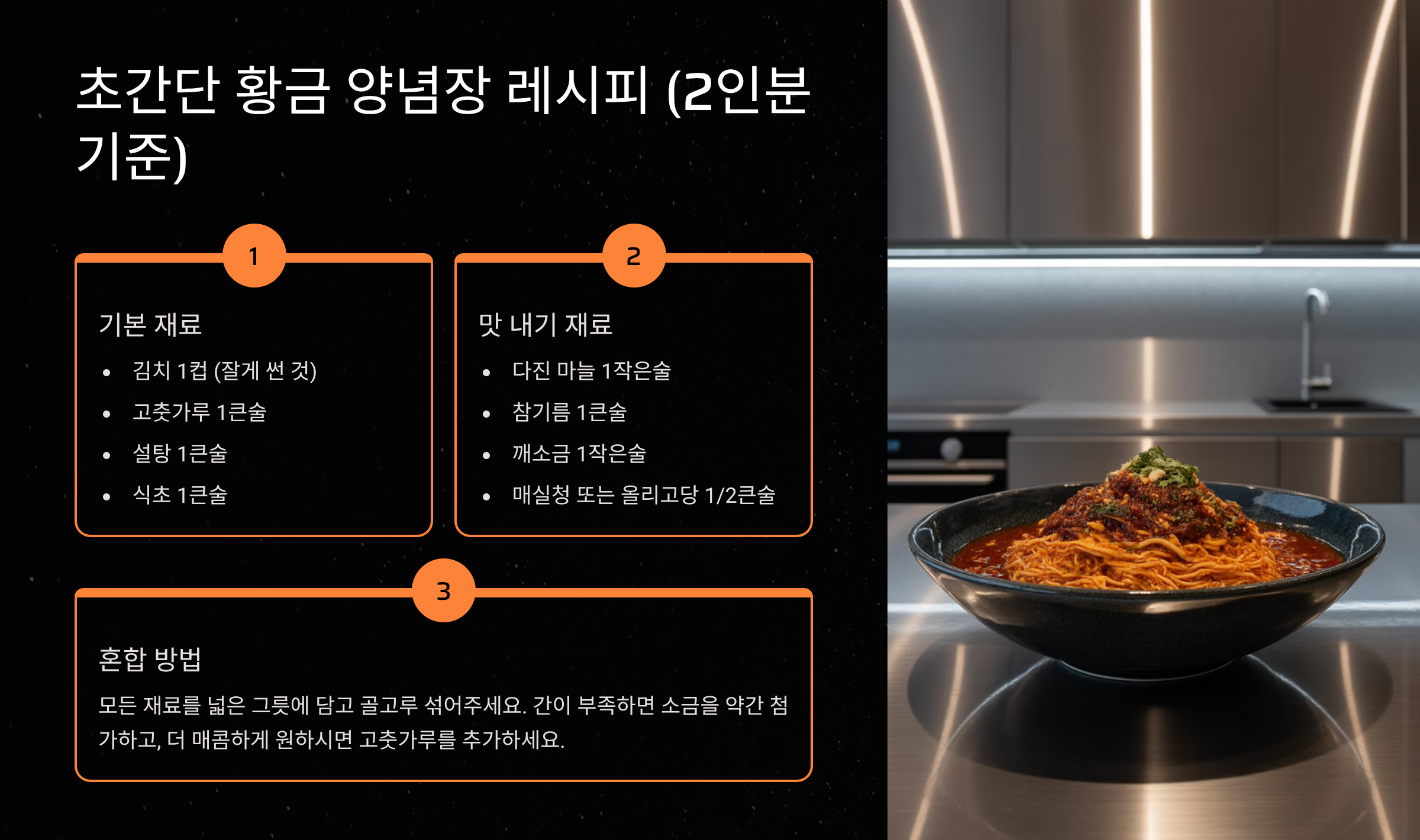 김치 비빔국수의 생명은 바로 **양념장**에 있습니다. 실패 없이 맛있고 매콤달콤한 양념장을 만드는 황금 비율을 소개합니다. 이 레시피는 기본적인 재료들로도 충분히 깊고 중독성 있는 맛을 낼 수 있도록 구성했습니다. 고추장과 고춧가루를 베이스로, 단맛과 신맛, 감칠맛을 더해주는 재료들을 적절히 배합하는 것이 중요합니다. 입맛에 따라 매운맛이나 단맛은 조절할 수 있으니, 처음에는 레시피대로 만든 후 기호에 맞게 가감해 보세요.