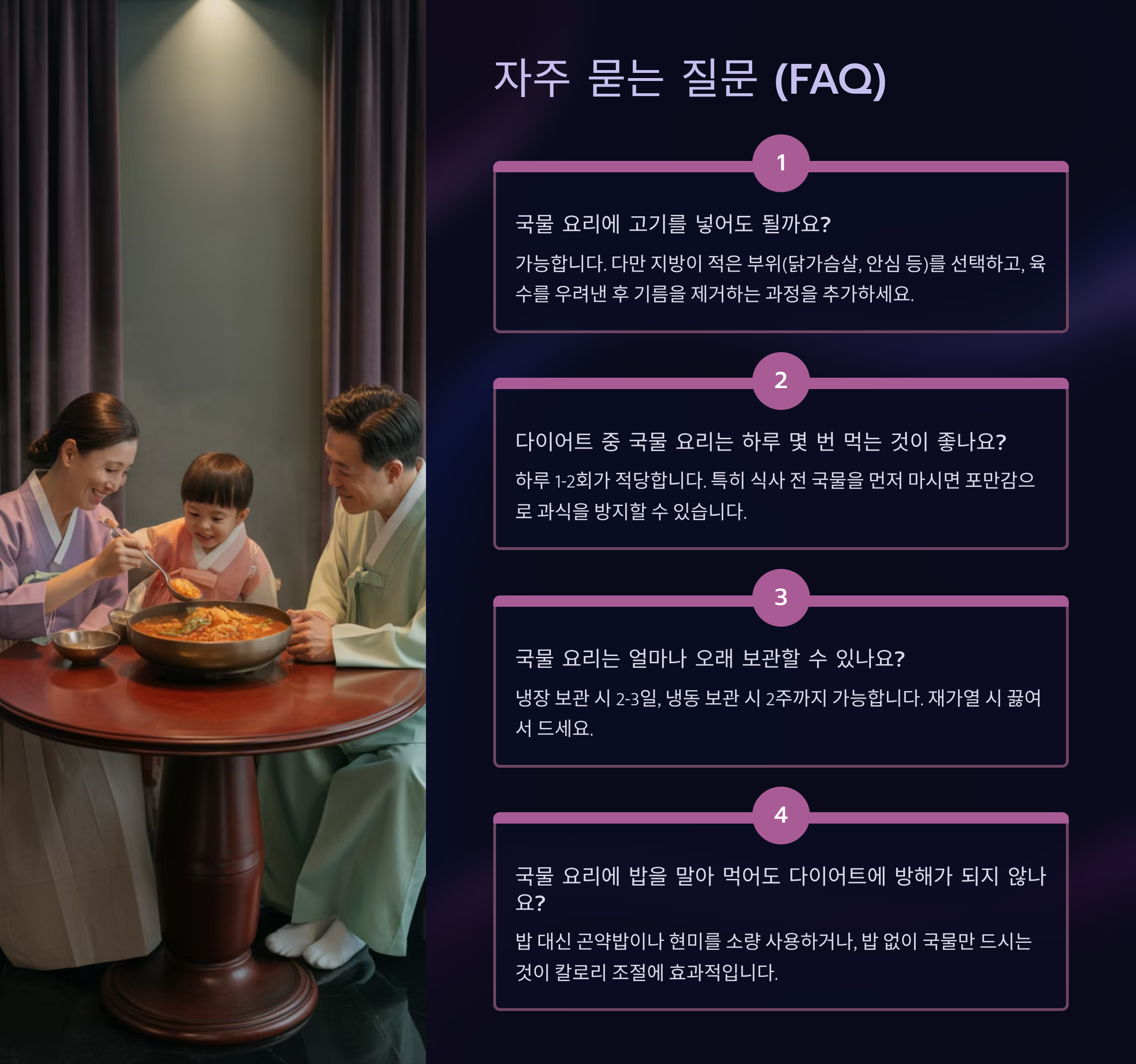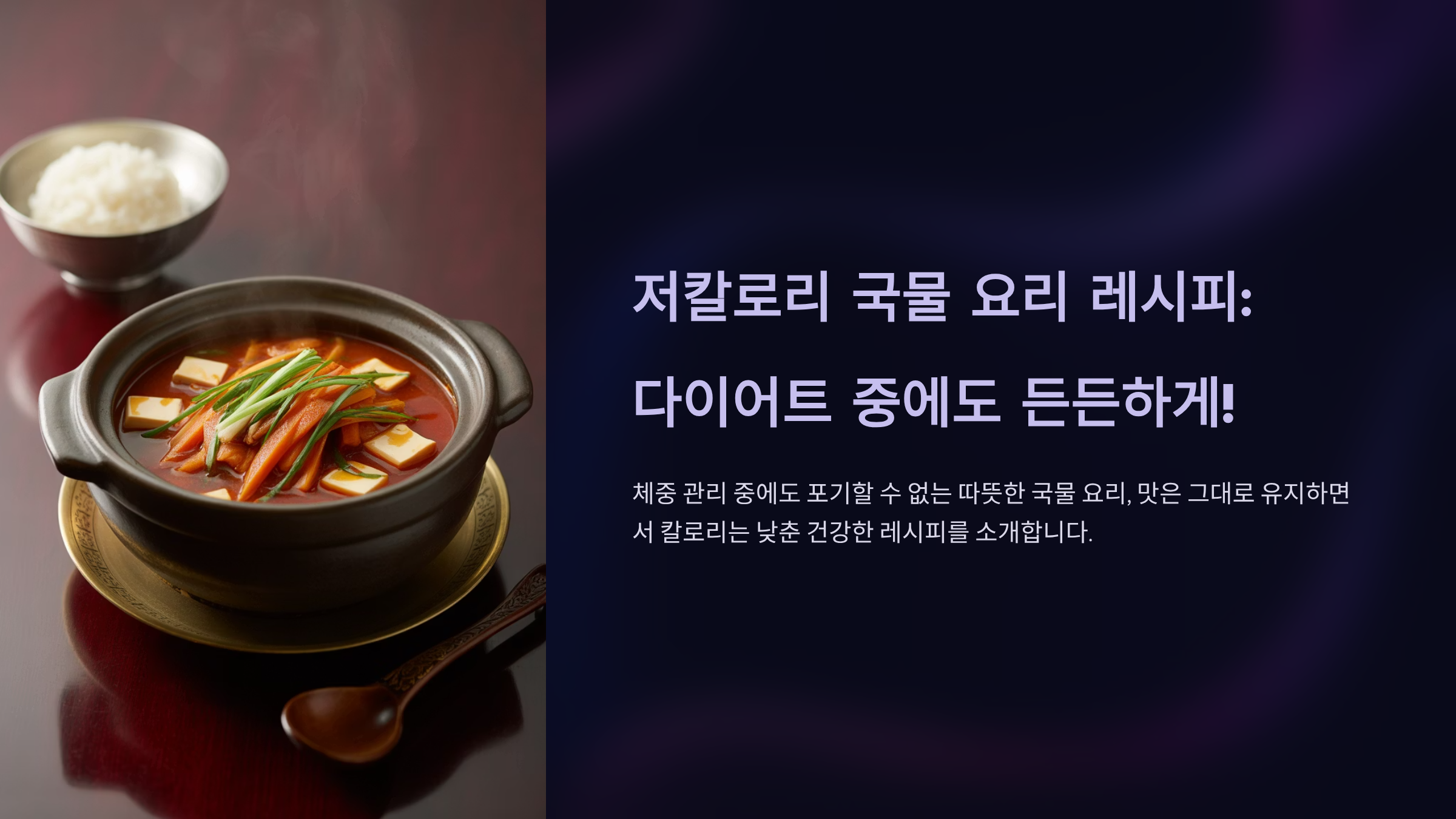 이 글은 다이어트와 맛을 동시에 잡고 싶은 분들을 위해, 칼로리는 낮추고 영양과 포만감은 높인 다양한 국물 요리 레시피를 소개합니다. **쉽게 구할 수 있는 재료**를 활용하여 누구나 집에서 간편하게 만들 수 있는 레시피들로 구성했습니다. 건강한 식단을 위한 요리법부터 영양 정보, 조리 팁까지 **EEAT(전문성, 권위성, 신뢰성)** 기반의 정보를 제공합니다.