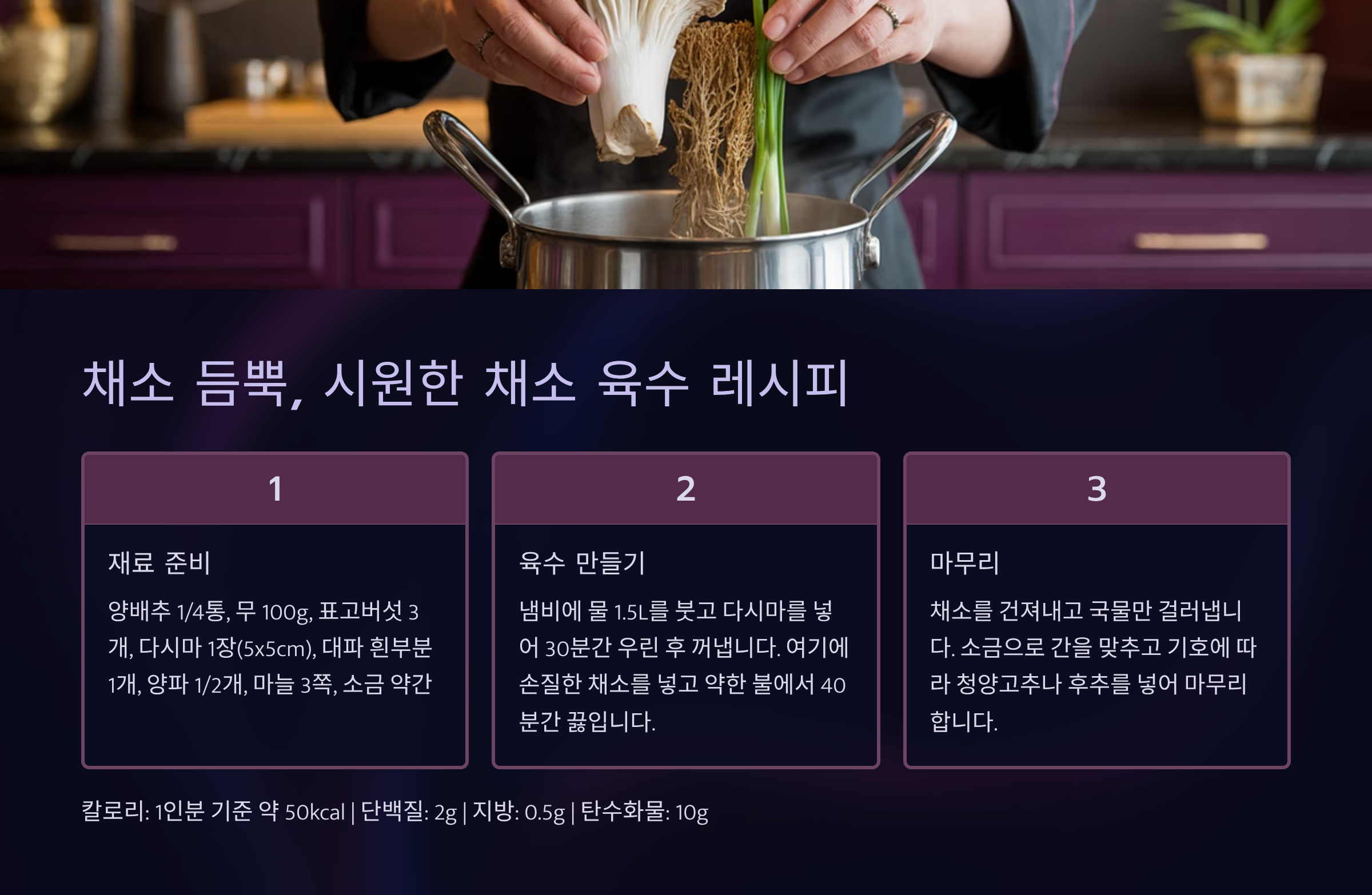 저칼로리 국물 요리의 기본은 바로 **건강한 육수**에서 시작됩니다. 일반적으로 사용하는 고기나 멸치 육수 대신, 다양한 채소를 활용한 육수는 칼로리가 낮고 깔끔하면서도 깊은 맛을 냅니다. 특히 무, 다시마, 양파, 버섯을 활용하면 자연스러운 감칠맛과 시원한 맛을 더할 수 있습니다.