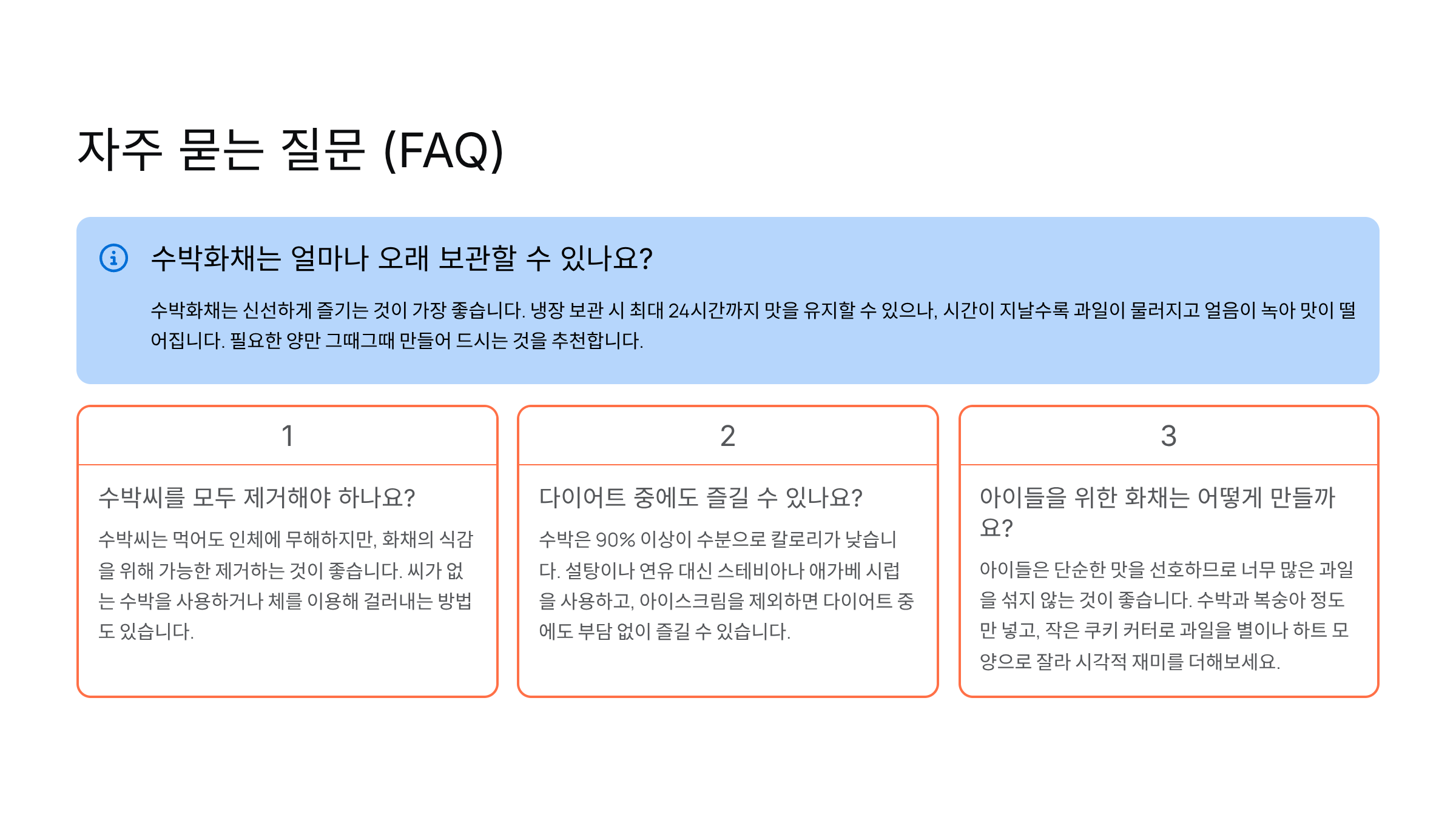 A5. 숟가락으로 수박을 떠내거나, 깍둑썰기해서 사용해도 충분히 맛있습니다. 예쁜 모양을 내지 않아도 괜찮습니다.