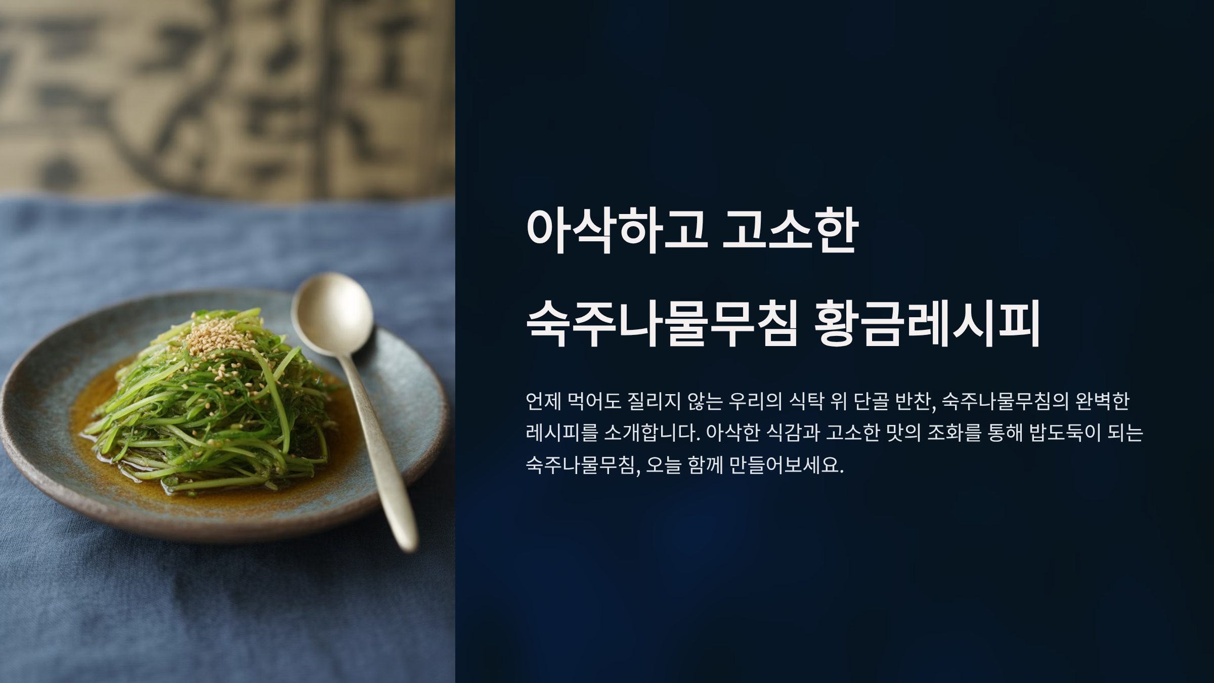이 글은 숙주나물무침의 실패 없는 황금레시피를 상세하게 알려드립니다. 숙주나물을 고르는 법부터 아삭한 식감을 유지하는 데치기 비법, 그리고 가장 중요한 양념장 비율까지, 숙주나물무침의 모든 것을 담았습니다. 이 레시피만 있다면 요리 초보자도 전문가처럼 맛있는 숙주나물무침을 만들 수 있습니다.