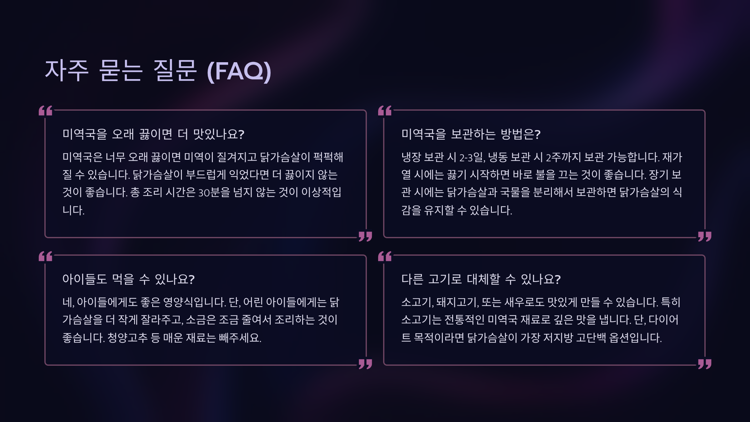이 글은 닭가슴살 미역국 레시피 및 효능에 대한 일반적인 정보를 제공하며, 특정 개인의 건강 상태나 식단에 대한 전문적인 조언이 아닙니다. 개인의 건강 상태나 식이 요법에 따라 레시피를 조절하거나 전문가와 상담하는 것을 권장합니다. 이 정보를 바탕으로 한 결정에 대해 작성자는 어떠한 책임도 지지 않습니다.