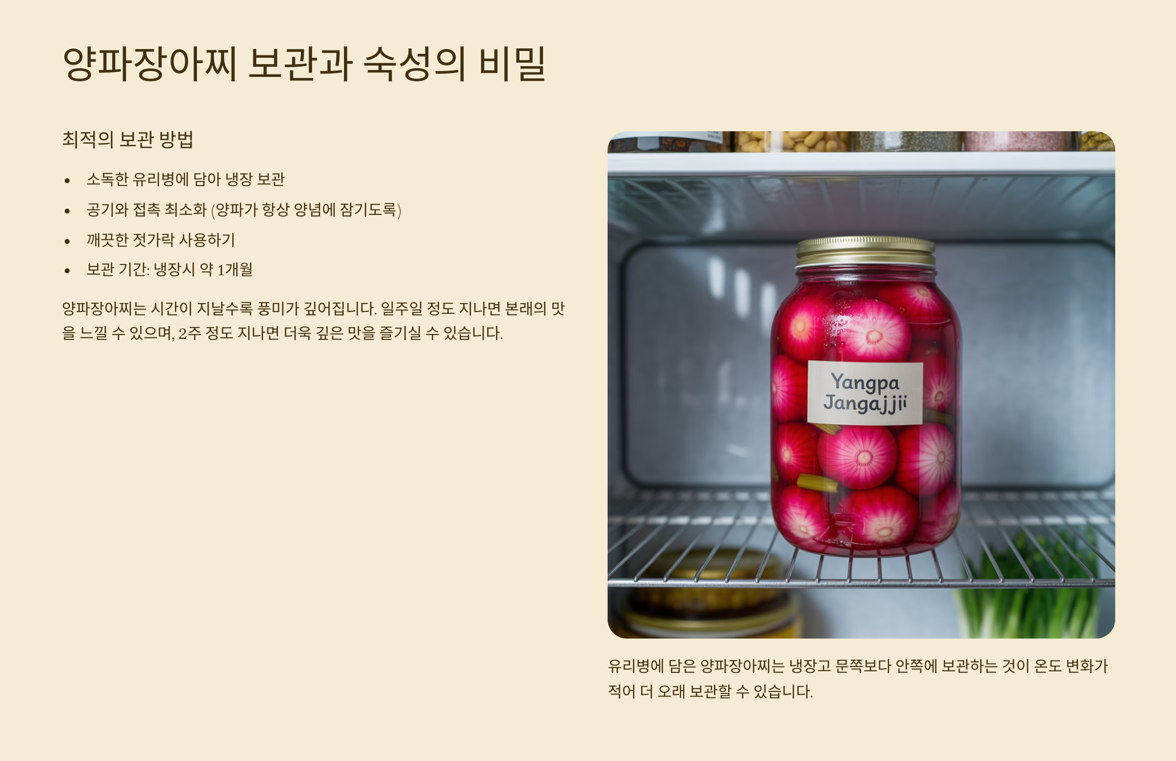 나는 이 보관 팁을 활용해 양파장아찌를 한 달 이상 맛있게 먹은 경험이 있어요. 보관법만 잘 지켜도 맛이 오래 가는 게 확실해요.