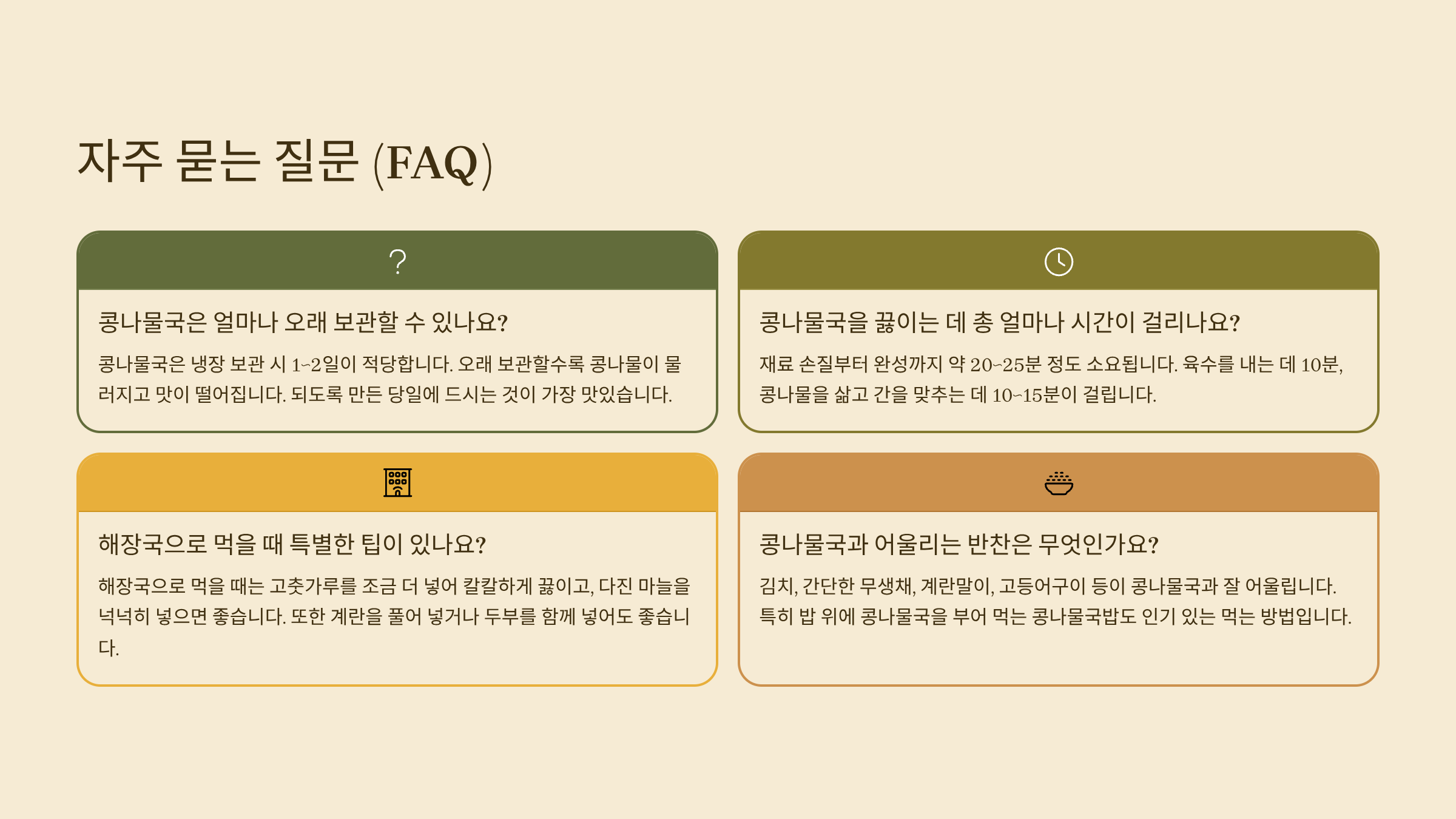| 콩나물 흐물거림 | 너무 오래 삶기 | 콩나물 상태를 보며 적정 시간 조리 |