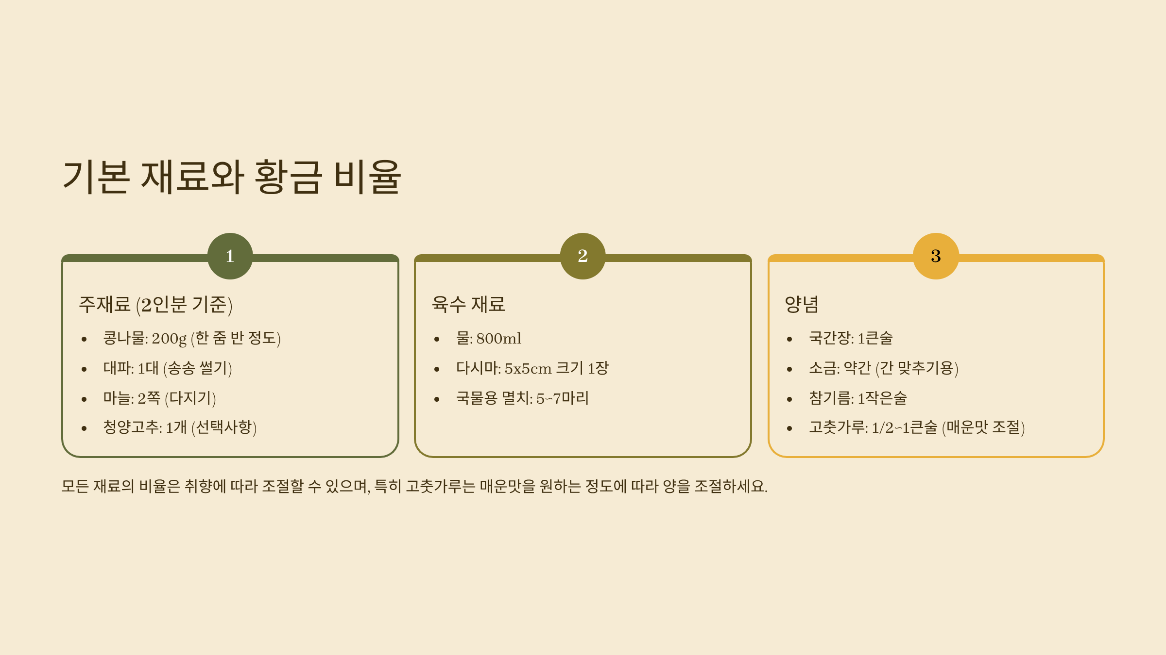 | 황태포 (선택) | 더 깊은 맛을 원할 때 추가 | 가볍게 볶아서 사용하면 비린내 제거 |
