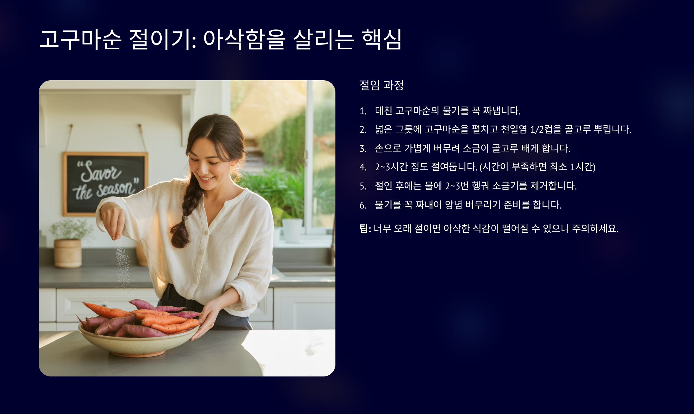 | 절이기 | 데친 고구마순에 굵은 소금을 뿌려 1시간 절인다 | 수분 제거, 아삭한 식감 유지 |