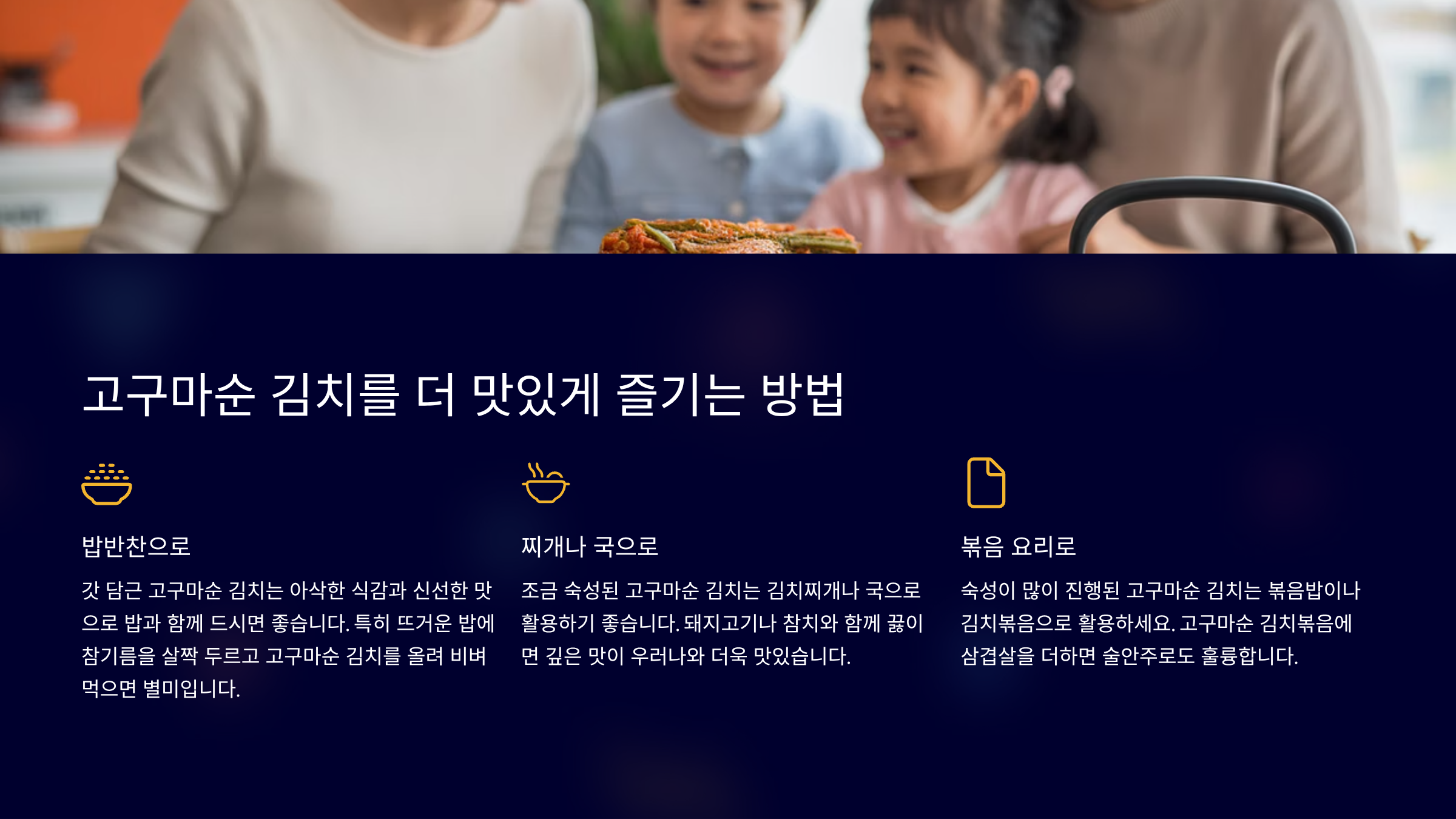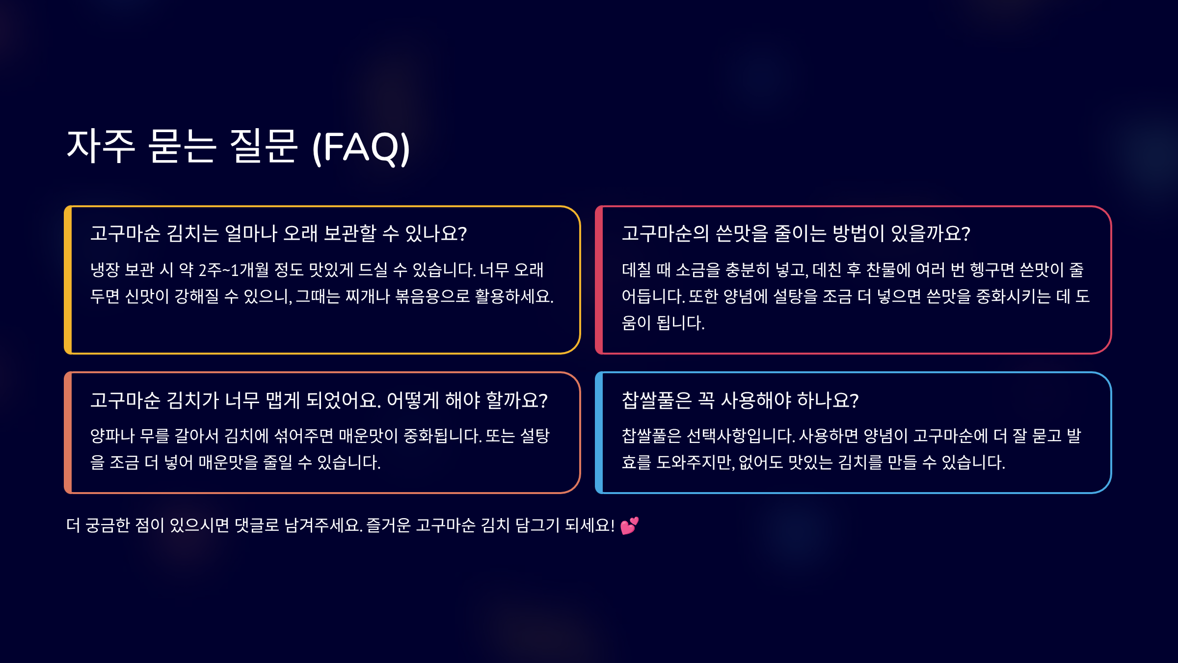 | 냉장 보관 | 상온 숙성 후 냉장고에 보관 | 김치의 신선도를 오래 유지 |