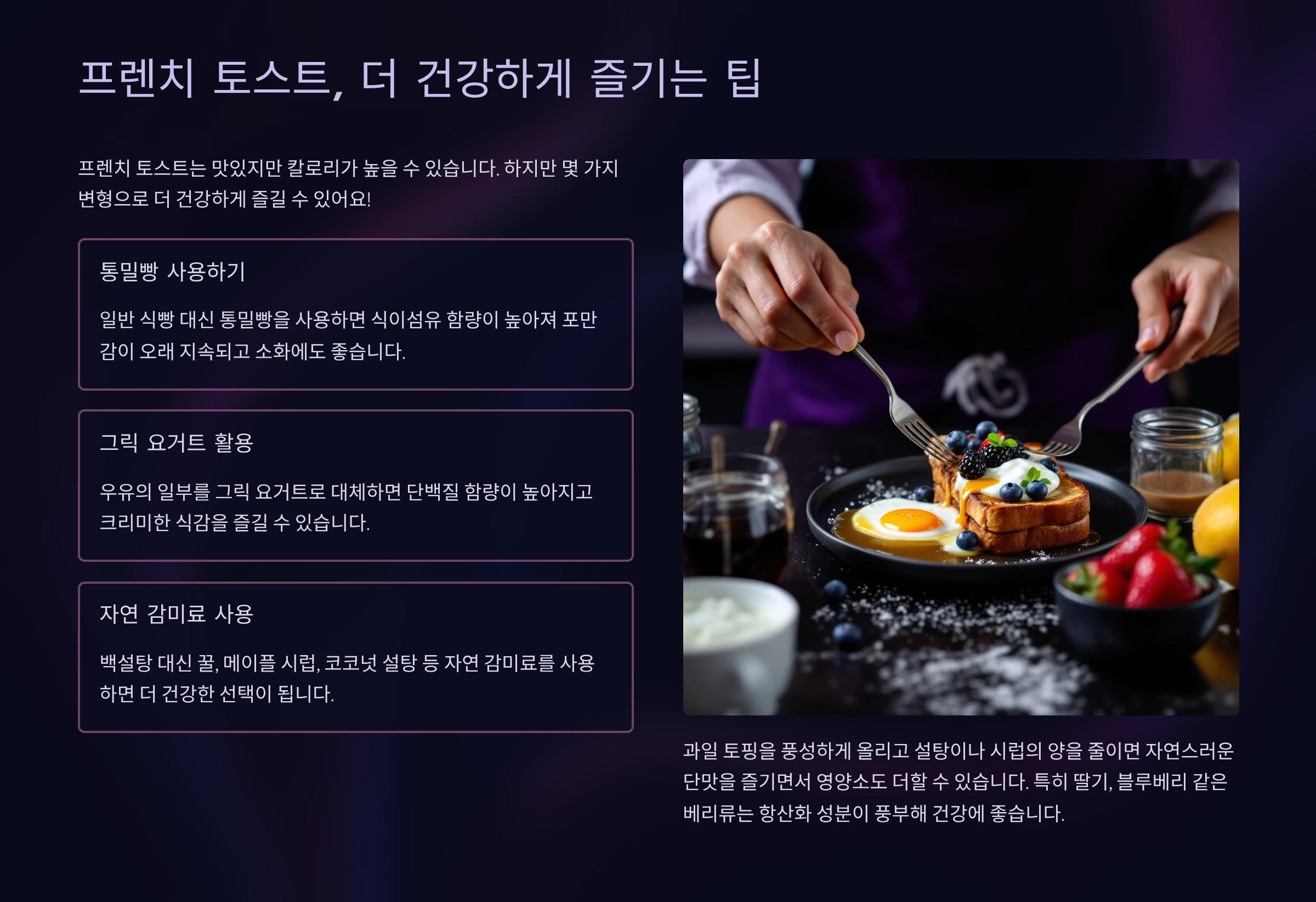 우유 대신 **아몬드 우유나 두유, 귀리 우유**를 사용하는 것도 좋은 팁입니다. 일반 우유보다 칼로리가 낮고, 유당 불내증이 있는 분들도 부담 없이 즐길 수 있습니다. 특히, 두유는 고소한 맛을 더해주고 단백질 함량이 높아 더욱 든든한 한 끼를 완성해줍니다. 프라이팬에 버터를 사용할 때는 너무 많은 양을 사용하기보다, 소량만 사용하거나 아보카도 오일처럼 **불포화지방산이 풍부한 오일**을 사용하면 더욱 건강한 요리가 됩니다. 이렇게 작은 변화만으로도 프렌치 토스트를 건강한 식단에 포함시킬 수 있습니다.