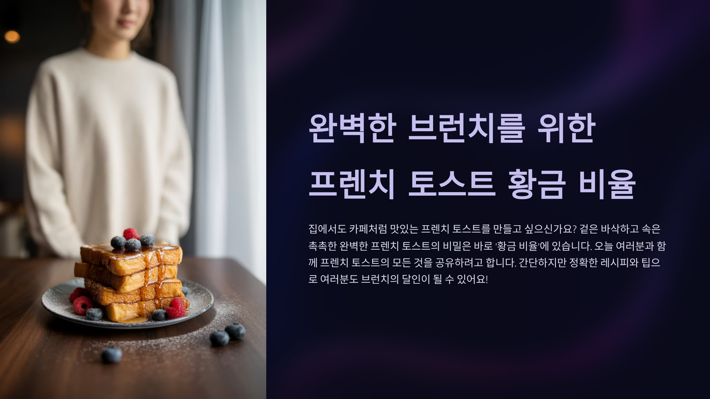 바쁜 아침, 든든하면서도 맛있는 한 끼를 고민하고 계신가요? 프렌치 토스트는 간단한 재료만으로도 근사한 브런치 메뉴를 완성할 수 있는 마법 같은 레시피입니다. 빵과 달걀, 우유만 있으면 누구나 쉽게 만들 수 있지만, 겉은 바삭하고 속은 촉촉한 완벽한 프렌치 토스트를 만들려면 몇 가지 핵심 비법이 필요합니다. 이 글에서는 초보자도 실패 없이 만들 수 있는 **프렌치 토스트 간단 레시피**와 함께, 촉촉한 식감을 만드는 황금 비율, 그리고 다양한 토핑으로 맛을 한층 업그레이드하는 방법까지 모두 알려드리겠습니다. 지금부터 여러분의 식탁을 행복하게 만들어줄 프렌치 토스트의 세계로 초대합니다.