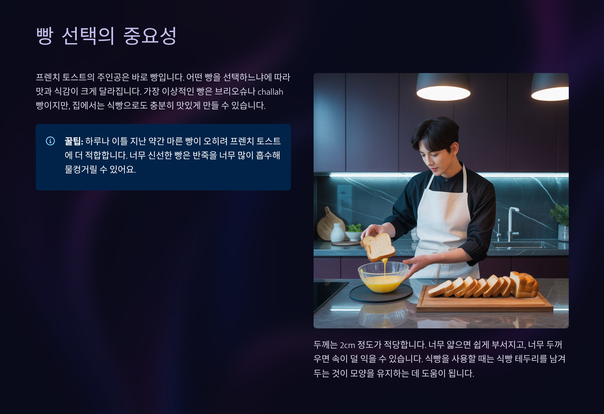 | 바게트 | 겉은 바삭하고 속은 쫄깃함 | 반죽에 충분히 담가 속까지 촉촉하게 만들기 |