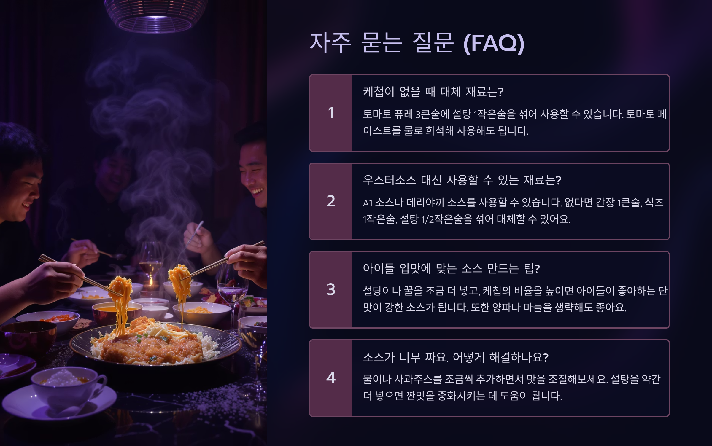 내가 생각했을 때, 돈까스 소스를 직접 만드는 것은 단순히 요리를 하는 행위를 넘어, 가족에게 정성이 담긴 한 끼 식사를 제공하는 특별한 경험입니다. 시판 소스에 익숙했던 아이들도 직접 만든 소스의 신선하고 깊은 맛에 감탄하며 더 즐겁게 식사할 수 있습니다. 예를 들어, 야채를 싫어하는 아이들을 위해 양파나 당근을 갈아 넣어 자연스러운 단맛을 추가하는 등, 가족의 건강을 고려한 맞춤형 소스를 만들 수 있다는 것도 큰 장점입니다. 집에서 만든 따뜻한 돈까스에 정성껏 만든 소스를 곁들이면, 외식 못지않은 훌륭한 한 끼 식사가 완성됩니다.
