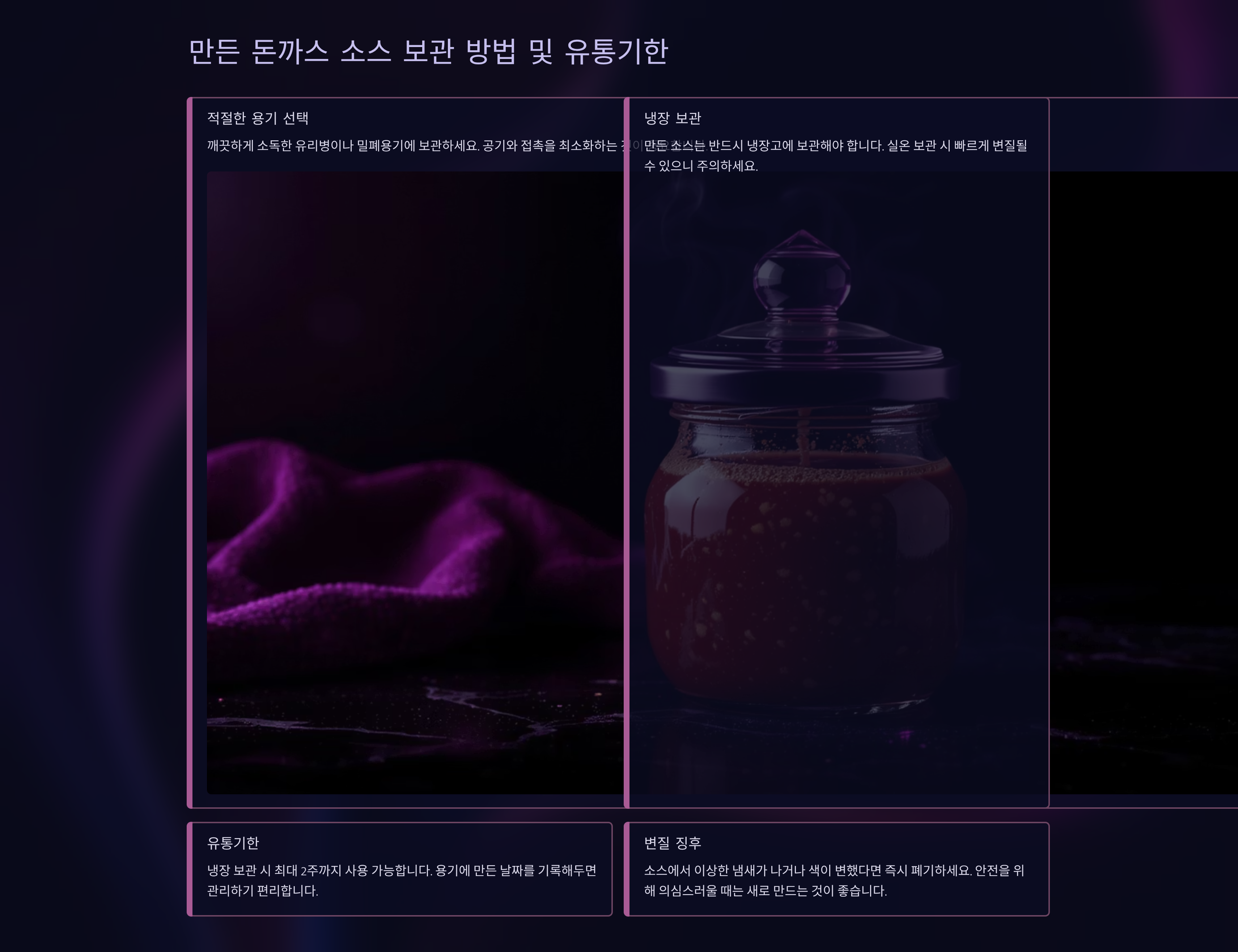 | 냉장 보관 | 밀폐 가능한 유리 용기 | 1~2주 |