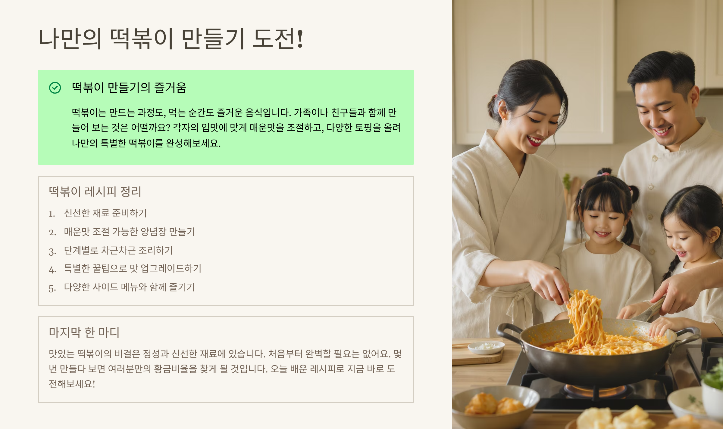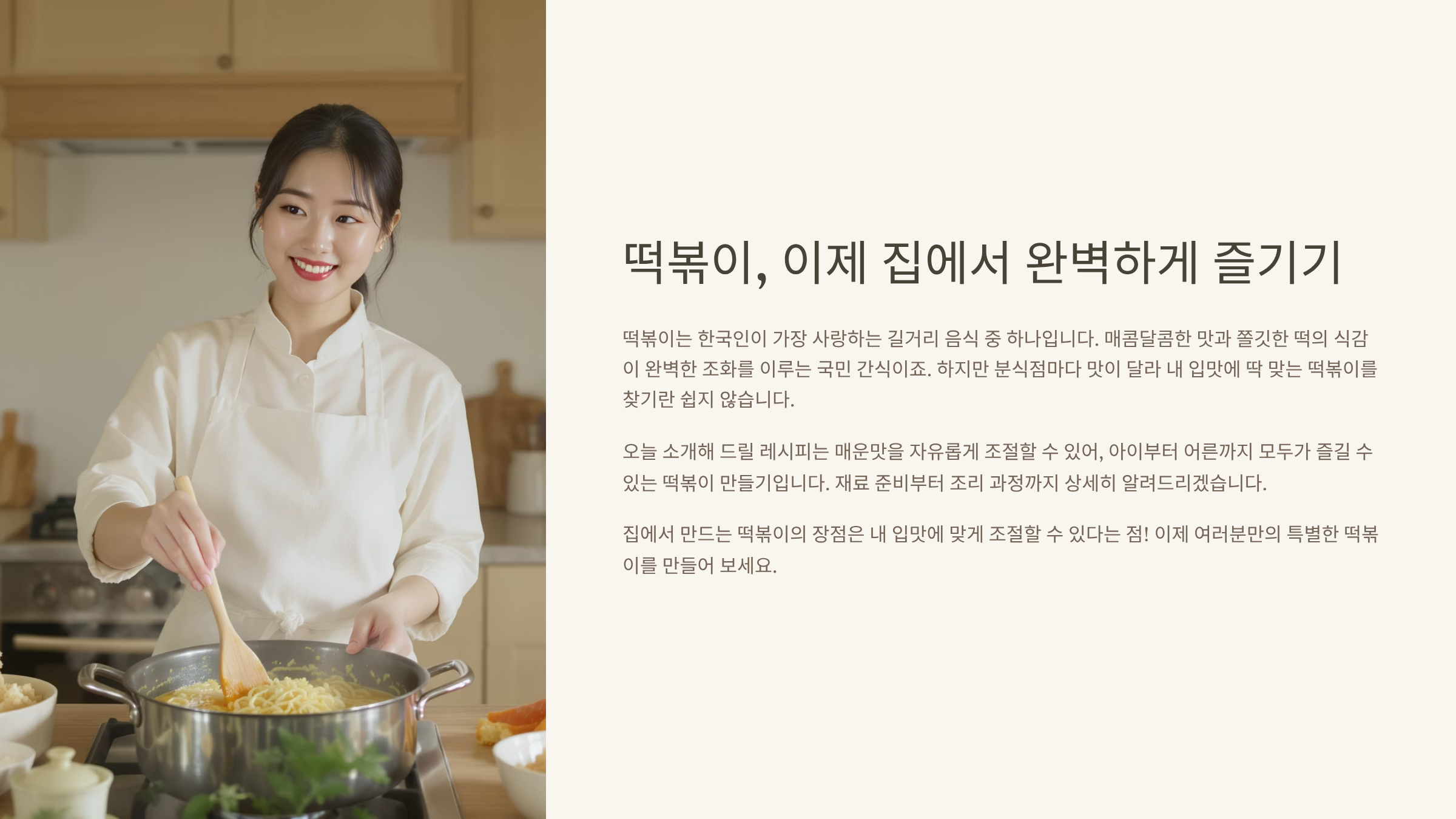 본 글은 농림축산식품부에서 제공하는 '전통 음식 조리법' 데이터를 참고하여, 가장 보편적이면서도 응용하기 쉬운 **매운맛 조절 가능한 떡볶이 레시피**를 제공합니다. 또한 여러 전문가들의 조언과 다년간의 요리 경험을 바탕으로, 초보자도 쉽게 따라 할 수 있도록 상세한 팁을 곁들였습니다. 이 글을 통해 여러분만의 특별한 떡볶이를 만들어 소중한 사람들과 함께 맛있는 시간을 보내시길 바랍니다.