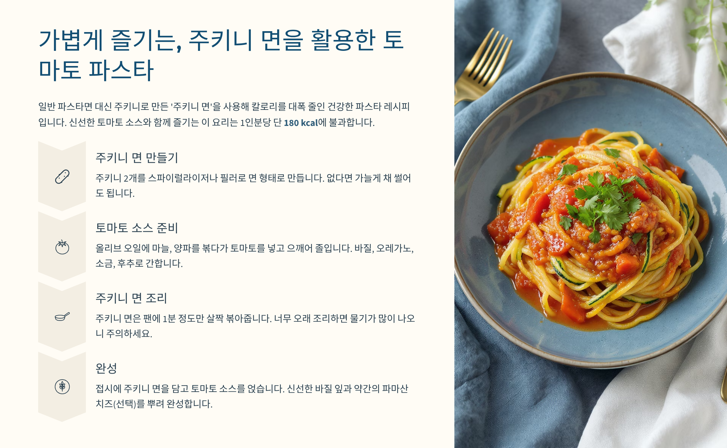 파스타를 좋아하지만 칼로리가 부담스럽다면, 주키니(애호박)를 면처럼 썰어 만든 **주키니 면 파스타**를 추천합니다. 주키니는 수분 함량이 높고 칼로리가 매우 낮아, 밀가루 면 대신 사용하면 가볍고 건강한 파스타를 만들 수 있습니다. **재료:** 주키니 1개, 토마토소스 1/2컵, 양파 1/4개, 마늘 2쪽, 올리브유 1T, 소금, 후추 약간. **만드는 법:** 1. 주키니는 채칼을 이용해 면 모양으로 썰어줍니다. 2. 팬에 올리브유를 두르고 다진 마늘과 양파를 볶아 향을 냅니다. 3. 토마토소스를 넣고 끓이다가 주키니 면을 넣고 살짝 볶아줍니다. (오래 볶으면 물이 생기므로 주의!) 4. 소금, 후추로 간을 맞추면 완성! (추정 칼로리: 1인분 기준 약 180kcal. 정확한 칼로리는 재료에 따라 달라질 수 있습니다.) 밀가루 면을 포기하고 싶지 않다면, 현미 파스타 면을 활용하는 것도 좋은 대안입니다.