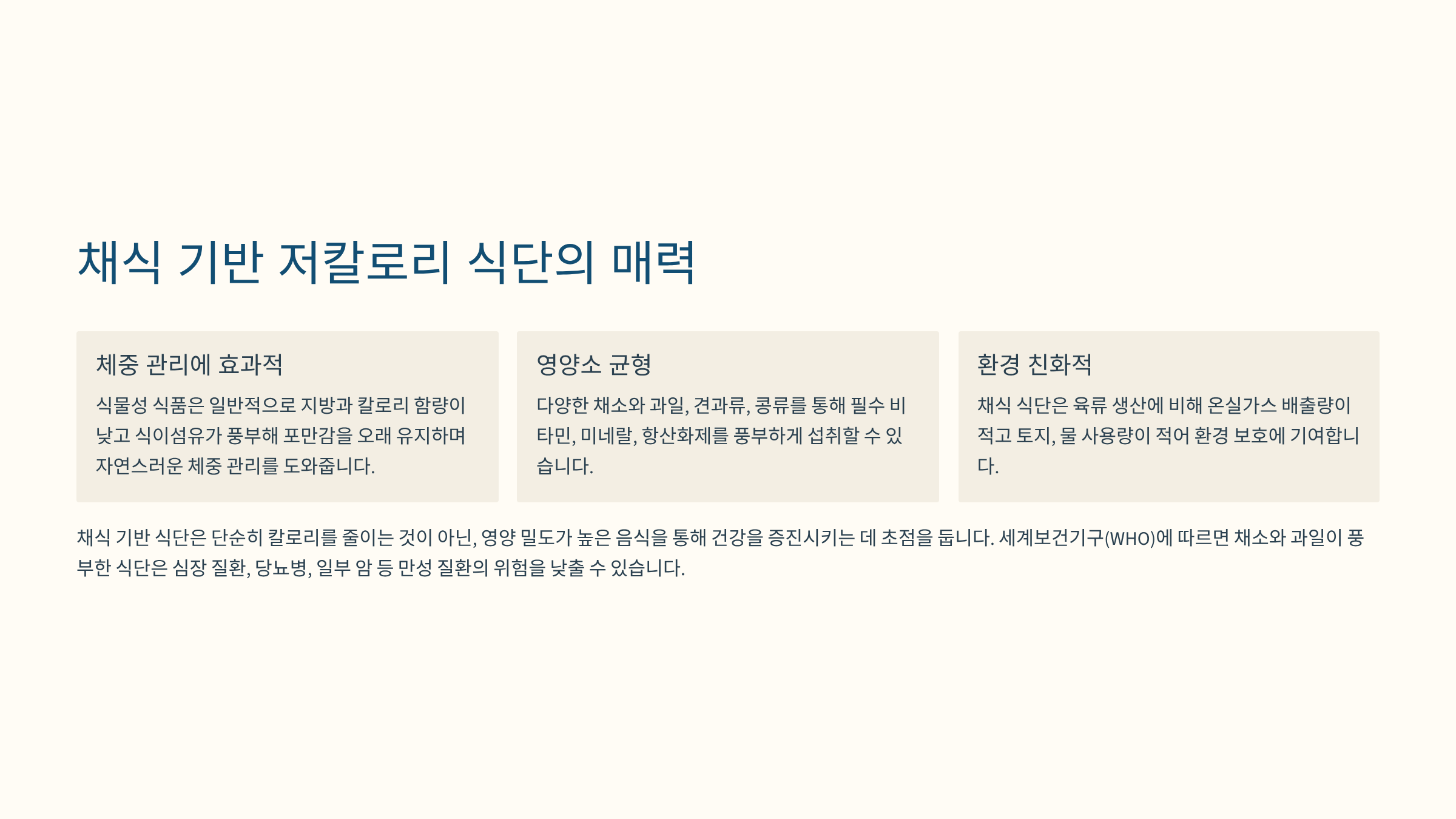채식 기반 저칼로리 식단은 단순히 체중 감량을 위한 것이 아니라, 건강한 라이프스타일을 위한 훌륭한 선택입니다. 채소, 과일, 견과류, 곡물 등을 주재료로 사용하기 때문에 **식이섬유**와 **비타민, 미네랄**이 풍부합니다. 이러한 영양소들은 소화를 돕고, 장 건강을 개선하며, 면역력 강화에도 도움을 줍니다. 또한, 채식 식단은 포화지방과 콜레스테롤 섭취를 줄이는 데 효과적이라 심혈관 질환 예방에도 긍정적인 영향을 미칠 수 있습니다. 가장 큰 장점 중 하나는 바로 포만감입니다. 식이섬유가 풍부한 채소는 적은 칼로리로도 오랫동안 포만감을 유지시켜주기 때문에, 식사량을 조절하는 데 큰 도움이 됩니다. 오늘 소개할 레시피들은 이러한 장점을 극대화하여, 건강하고 맛있게 다이어트할 수 있는 방법을 제시합니다.