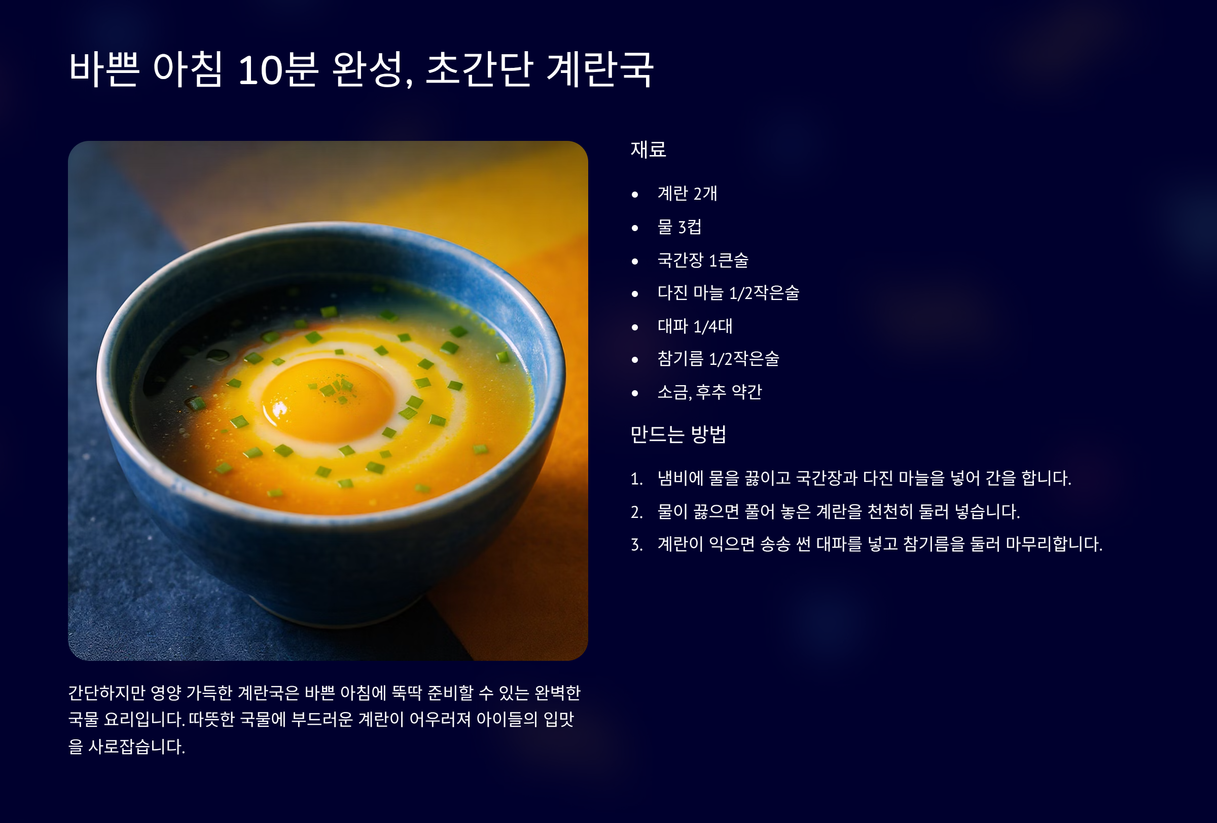 간식 레시피 확인하기6. 바쁜 아침 10분 완성, 초간단 계란국