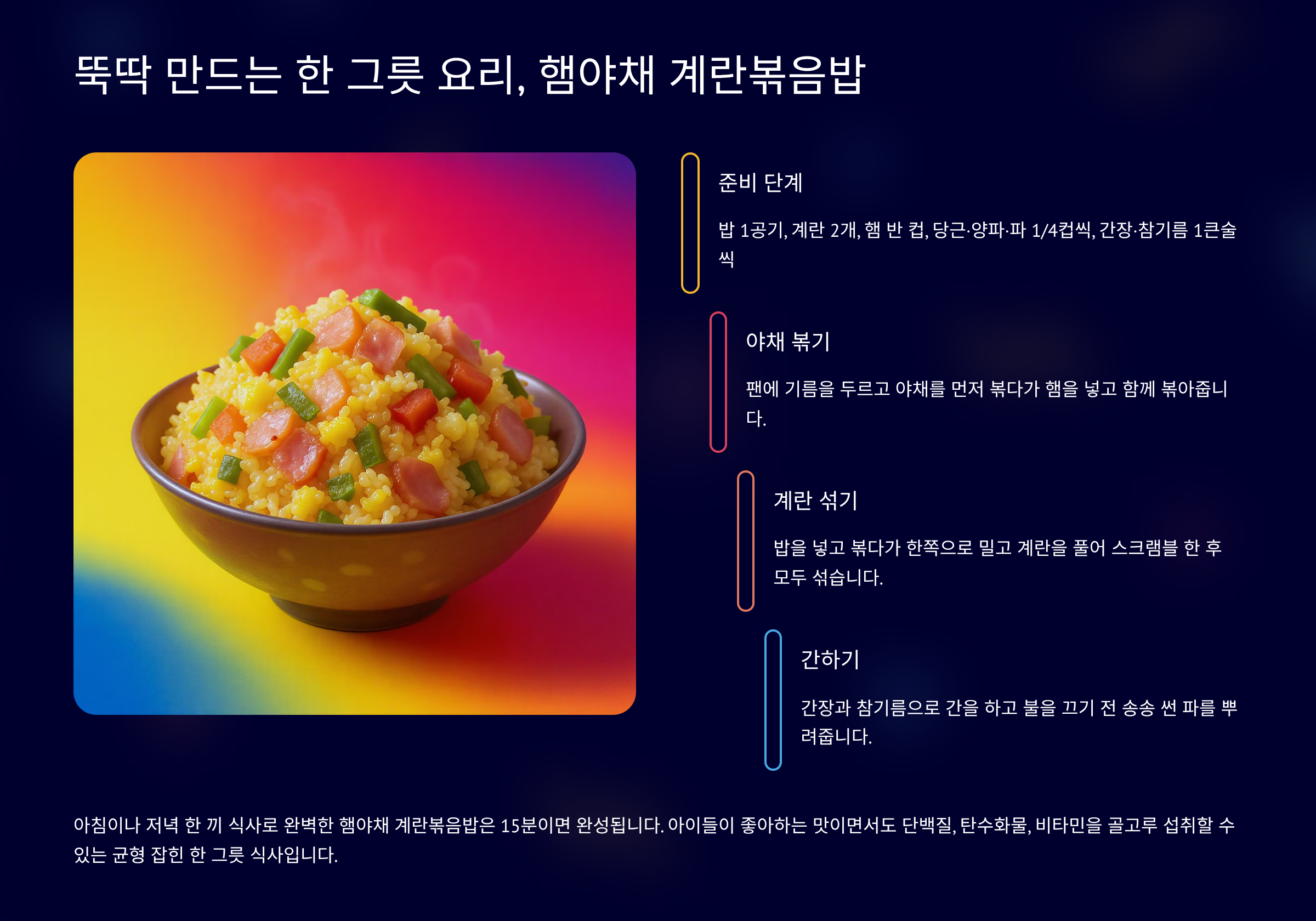 밥과 반찬을 따로 차리기 번거로운 날, 햄야채 계란볶음밥은 훌륭한 해결책이 되어줍니다. 한 그릇에 밥과 계란, 채소, 햄이 모두 들어가 있어 영양적으로도 균형 잡힌 식사가 가능합니다. 이 요리의 가장 큰 장점은 바로 '간편함'입니다. 재료를 잘게 썰어 볶기만 하면 되므로, 요리 시간이 짧고 설거지 부담도 적습니다. 먼저 햄과 양파, 당근, 호박 등 좋아하는 채소를 잘게 다져줍니다. 팬에 기름을 두르고 햄과 채소를 볶다가 밥을 넣고 볶아줍니다. 밥이 볶아지면 한쪽에 계란을 넣어 스크램블 에그처럼 볶아준 뒤, 밥과 섞어줍니다. 마지막으로 굴소스나 간장으로 간을 맞춰주면 끝입니다. 아이들은 햄과 알록달록한 채소의 조합을 좋아하여, 밥을 잘 먹지 않는 아이에게도 효과적인 메뉴가 될 수 있습니다.
