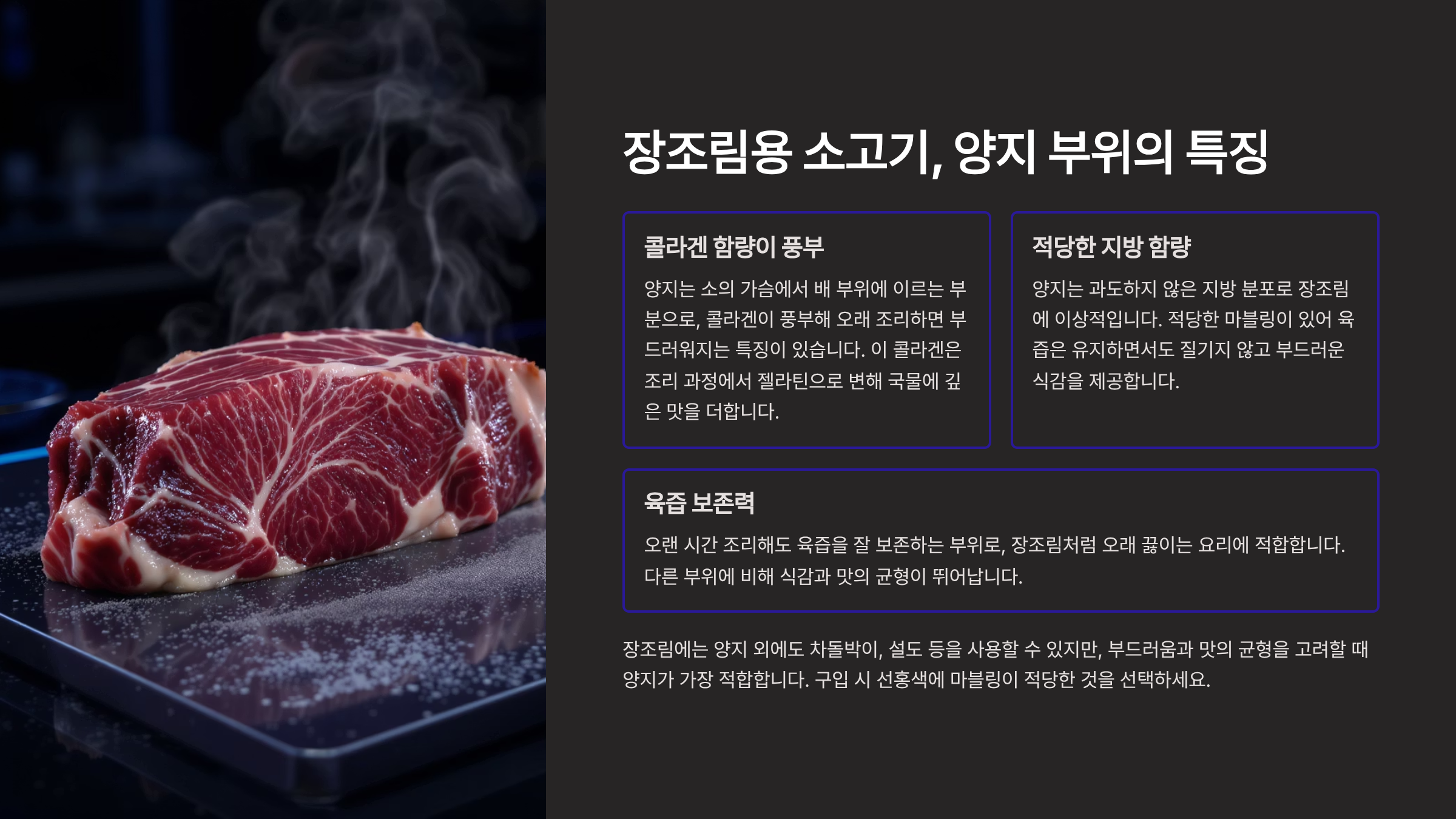 | 양지 | 지방이 적고 육질이 단단하며, 푹 익히면 부드럽게 찢어짐 |