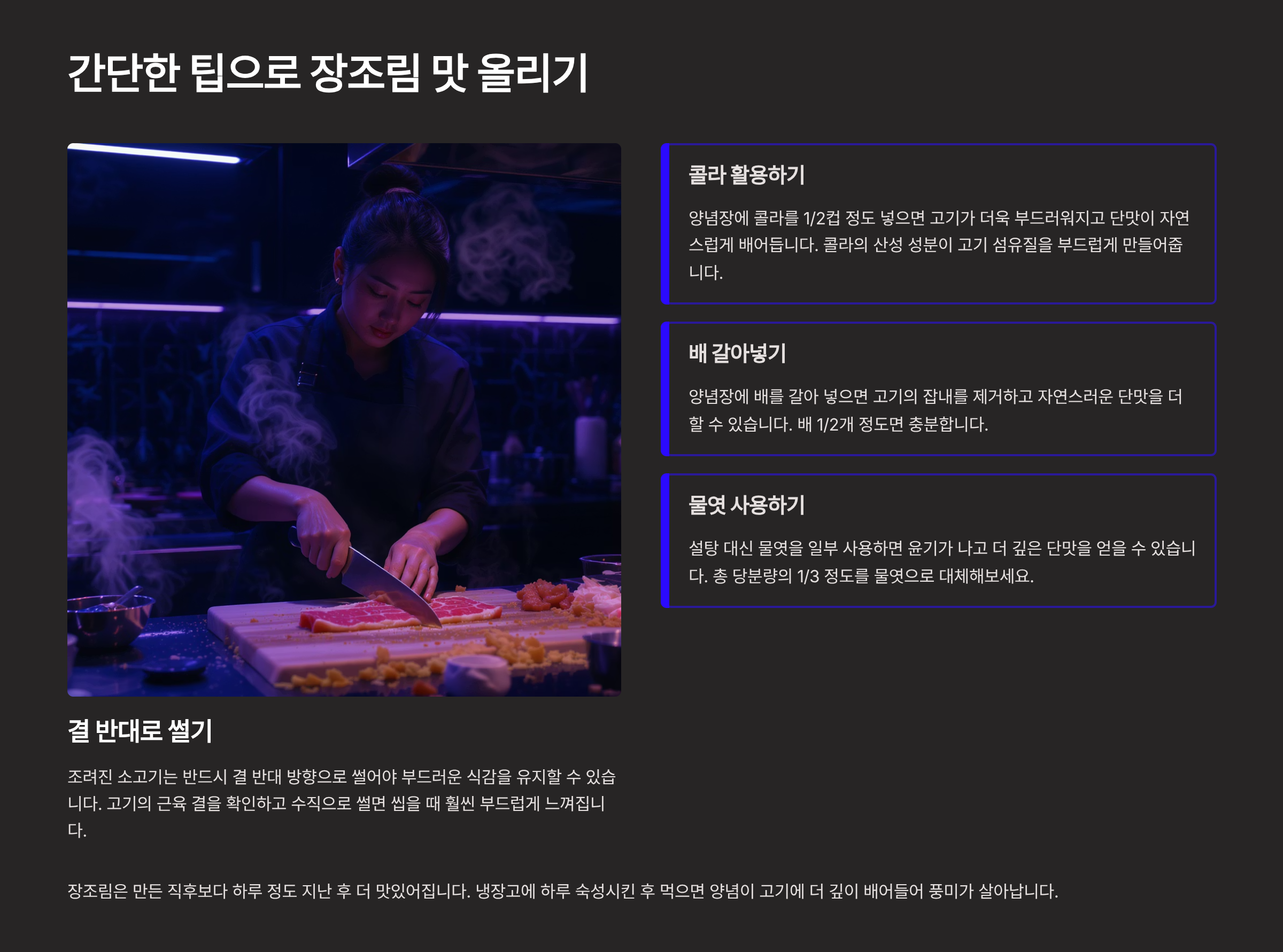 | 양념 졸이기 | 고기를 넣고 약한 불에 충분히 졸여야 간이 잘 배어듬 |