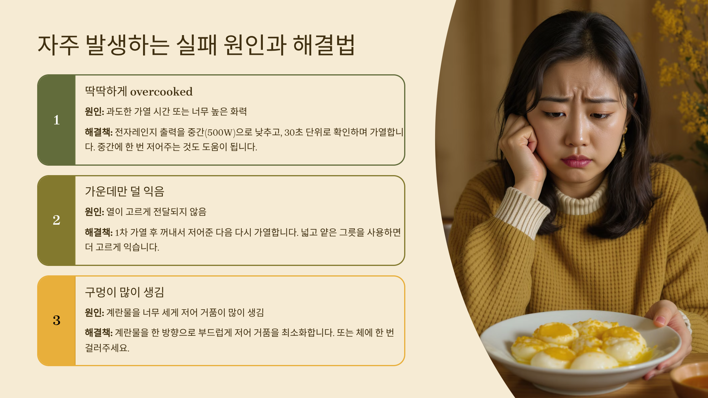 | 조리 시간 부족 | 계란이 덜 익음 | 30초씩 추가 조리 후 뜸들이기 |