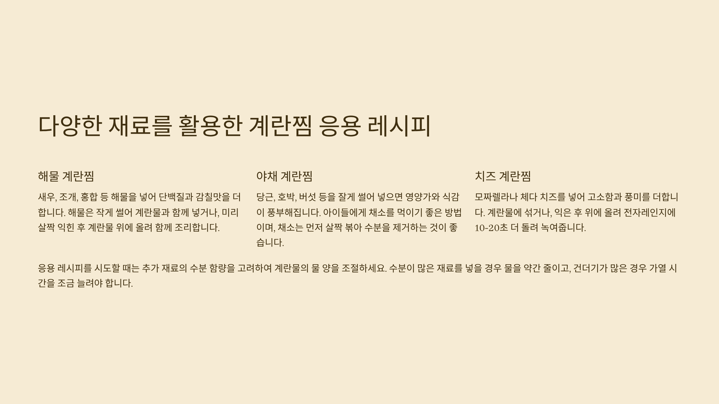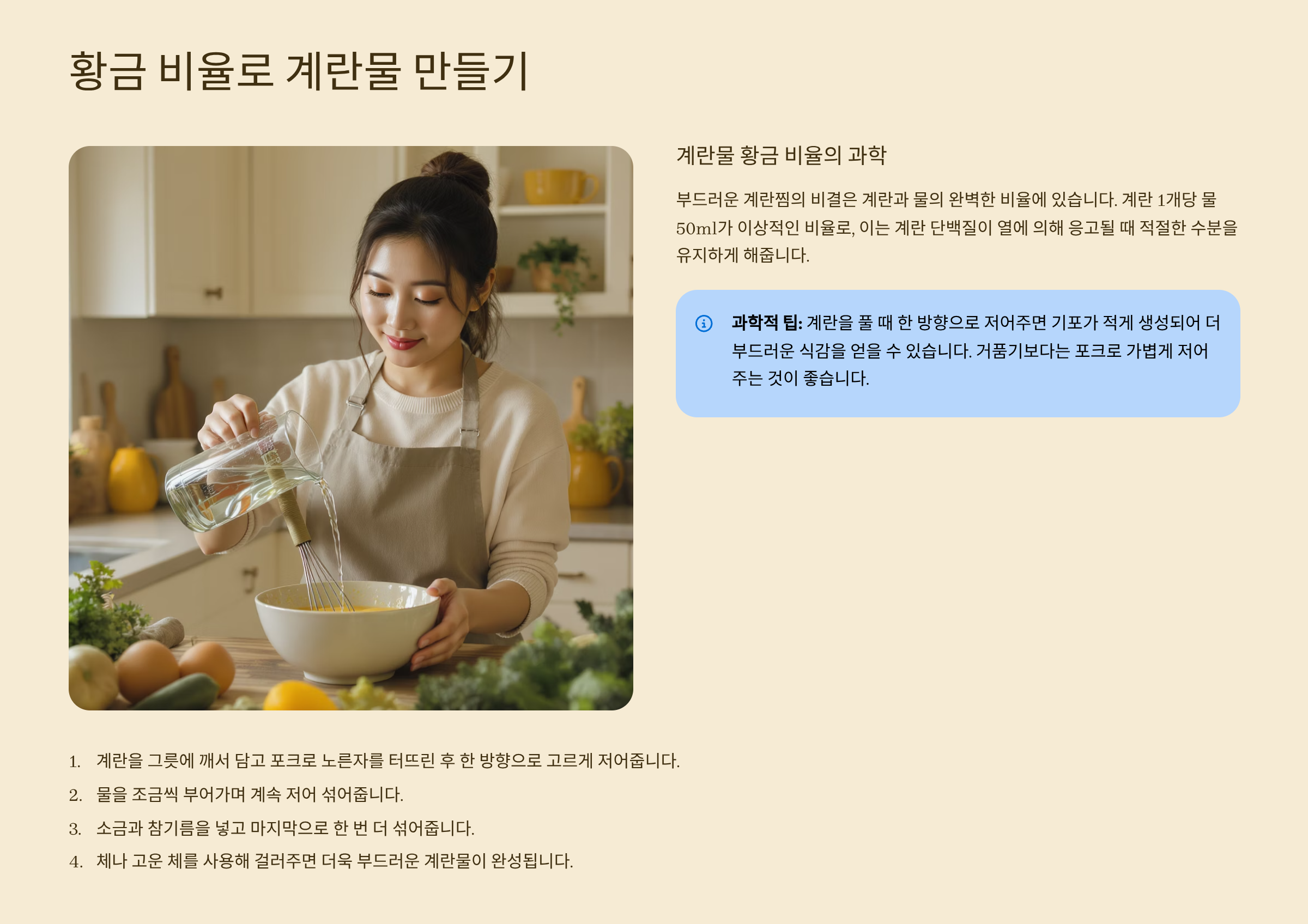 | 물(육수) | 180ml | 계란의 1.5배 비율 (추정치) |