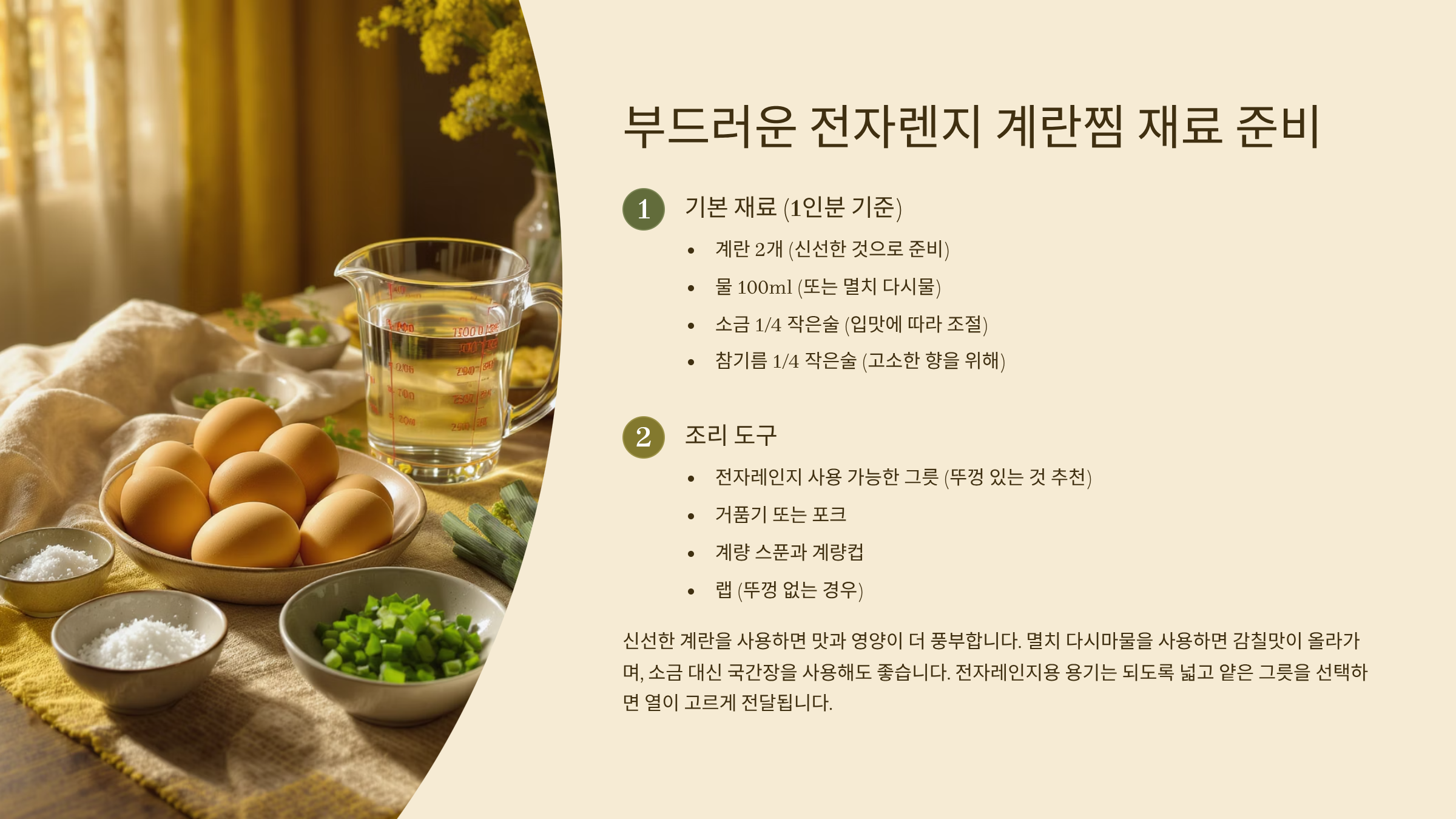 전자레인지로 완벽한 계란찜을 만들기 위해서는 재료 준비 단계부터 신경 써야 합니다. 가장 중요한 재료는 신선한 계란과 육수입니다. 계란은 상온에 미리 꺼내두어 차가운 기운을 빼면 더욱 부드러운 식감을 낼 수 있습니다. 육수는 멸치 다시마 육수나 닭 육수 등을 사용하면 감칠맛을 더할 수 있으며, 없다면 생수를 사용해도 괜찮습니다. 이때 물의 양이 계란찜의 부드러움을 결정하는 가장 중요한 요소이므로 정확하게 계량하는 것이 필수입니다.
