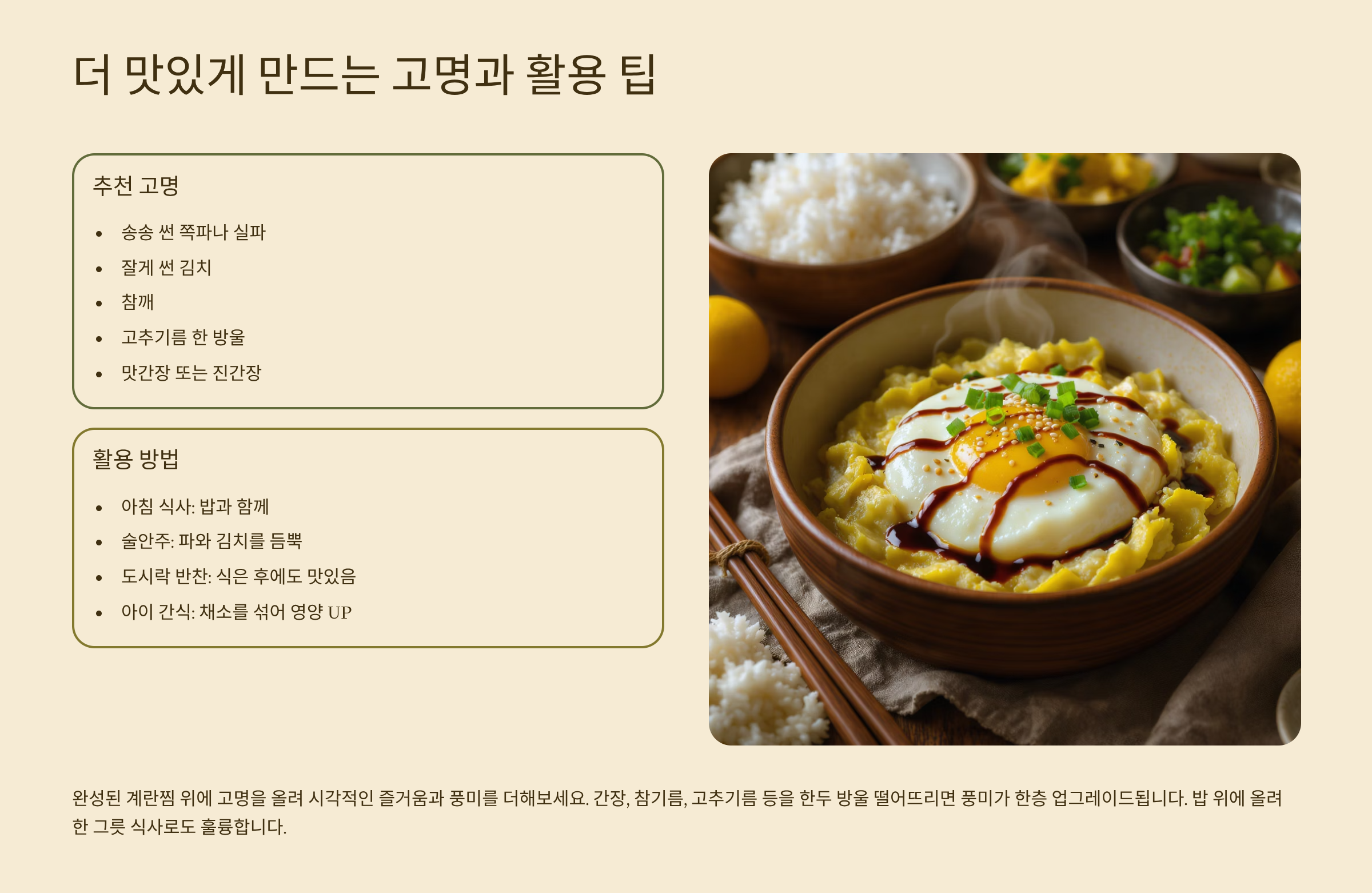 전자레인지 계란찜은 기본 레시피만으로도 훌륭하지만, 몇 가지 고명을 추가하면 더욱 풍성한 맛과 비주얼을 자랑합니다. 가장 간단한 고명은 쪽파나 깨입니다. 쪽파를 얇게 송송 썰어 익은 계란찜 위에 뿌려주면 싱그러운 색감과 향긋한 풍미를 더할 수 있습니다. 깨는 고소한 맛을 더해 계란찜의 맛을 한층 끌어올립니다. 이 외에도 다진 김치, 잘게 썬 참치, 옥수수 등을 넣어주면 아이들이 더 좋아하는 영양 계란찜을 만들 수 있습니다.