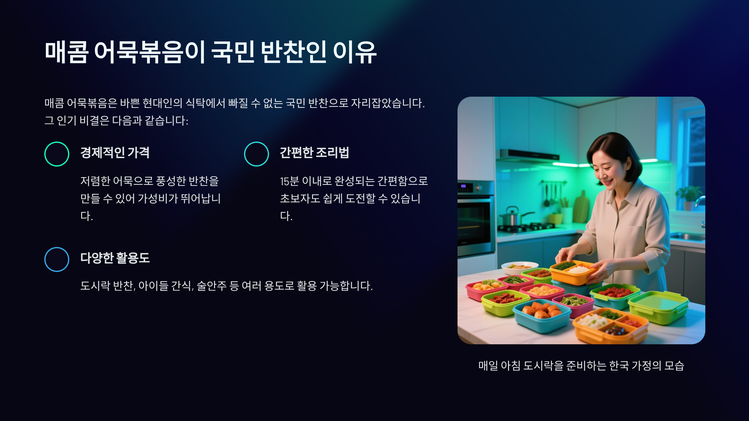 매콤 어묵볶음은 한국인의 식탁에서 빠질 수 없는 대표적인 반찬입니다. 이러한 인기의 배경에는 몇 가지 중요한 이유가 있습니다. 첫째, **뛰어난 가성비**입니다. 어묵은 다른 식재료에 비해 가격이 저렴하고 보관이 용이하여 언제든 쉽게 요리할 수 있습니다. 둘째, **간단한 조리 과정**입니다. 복잡한 과정 없이 재료를 썰고 양념장과 함께 볶기만 하면 되므로, 요리 초보자도 실패 없이 만들 수 있습니다. 셋째, **밥도둑으로서의 역할**입니다. 매콤달콤한 양념이 밥과 잘 어우러져 한 그릇을 뚝딱 비우게 만드는 마성의 매력이 있습니다. 넷째, **다양한 활용성**입니다. 매콤 어묵볶음은 그냥 반찬으로 먹어도 좋지만, 볶음밥이나 김밥 재료로 활용하거나, 떡볶이에 넣어 함께 조리해도 잘 어울립니다. 마지막으로, **도시락 반찬으로서의 완벽함**입니다. 식어도 맛이 변하지 않고 양념이 쉽게 흐르지 않아 도시락을 싸는 사람들에게 최고의 선택지가 됩니다. 이처럼 매콤 어묵볶음은 맛, 가격, 편의성, 활용성 모두를 갖춘 만능 반찬입니다.