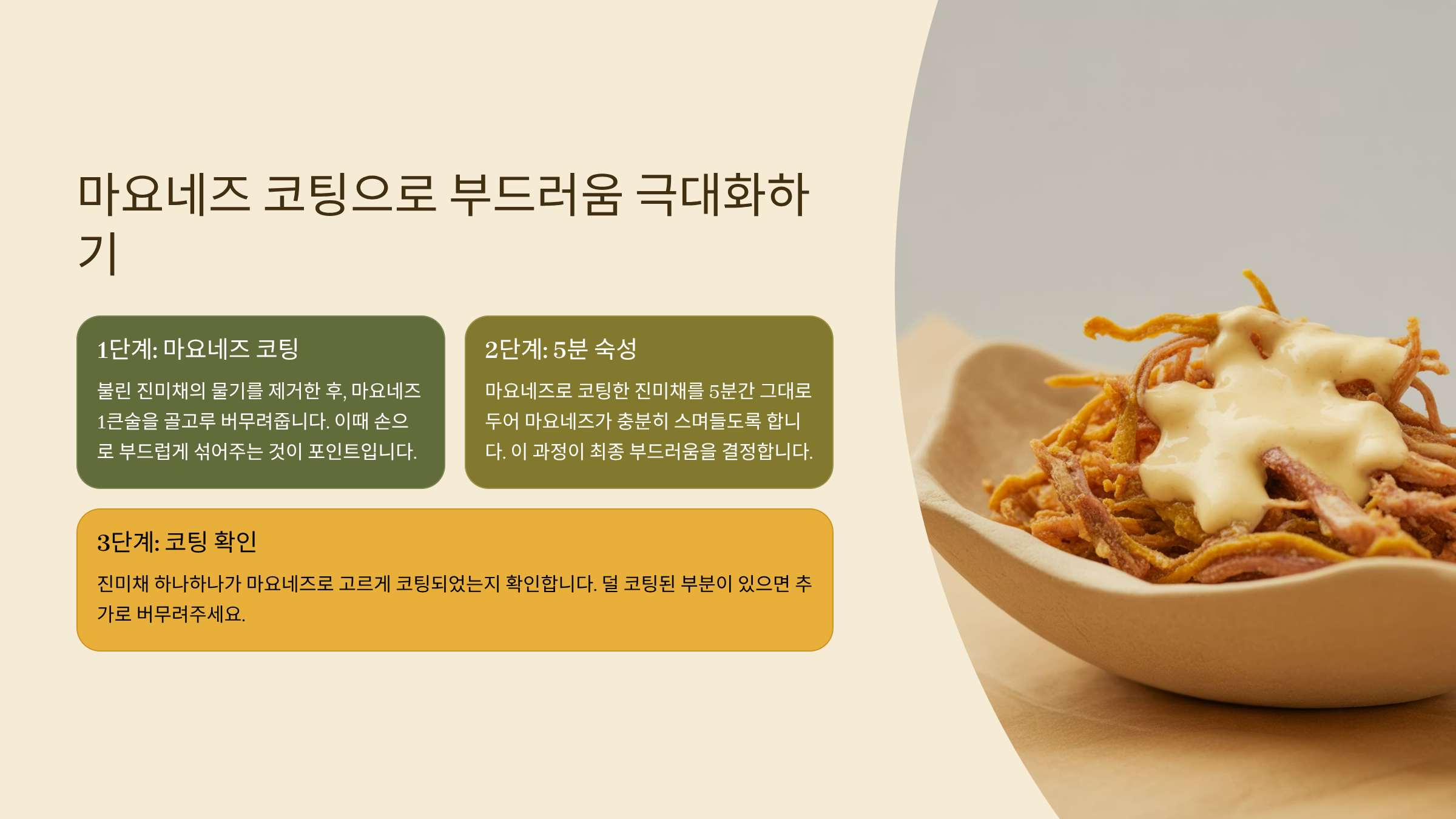 진미채볶음을 실패 없이 **부드럽고 촉촉하게** 만드는 가장 결정적인 단계는 바로 **마요네즈 코팅**입니다. 마요네즈의 주성분인 기름(지방)과 유화된 계란 성분이 진미채의 표면을 얇게 감싸, 조리 시 **열과 양념의 수분이 직접 진미채 섬유질에 닿는 것을 차단**합니다. 이로 인해 진미채의 단백질이 급격히 응고되어 딱딱해지는 현상(질겨짐)을 근본적으로 막아줍니다. 진미채 200g 당 마요네즈 2~3큰술이 황금 비율이며, 양념장을 만들기 **전**에 이 과정을 완료해야 합니다. 마요네즈를 넣고 조물조물 버무릴 때, 손의 온기로 진미채가 살짝 이완되어 더욱 부드러운 상태가 되므로, 장갑을 끼고 충분히 버무려주는 것이 중요합니다. 이 과정은 딱딱함을 방지할 뿐만 아니라, 마요네즈의 고소한 풍미가 진미채의 비린 맛을 잡아주는 일석이조의 효과도 있습니다.