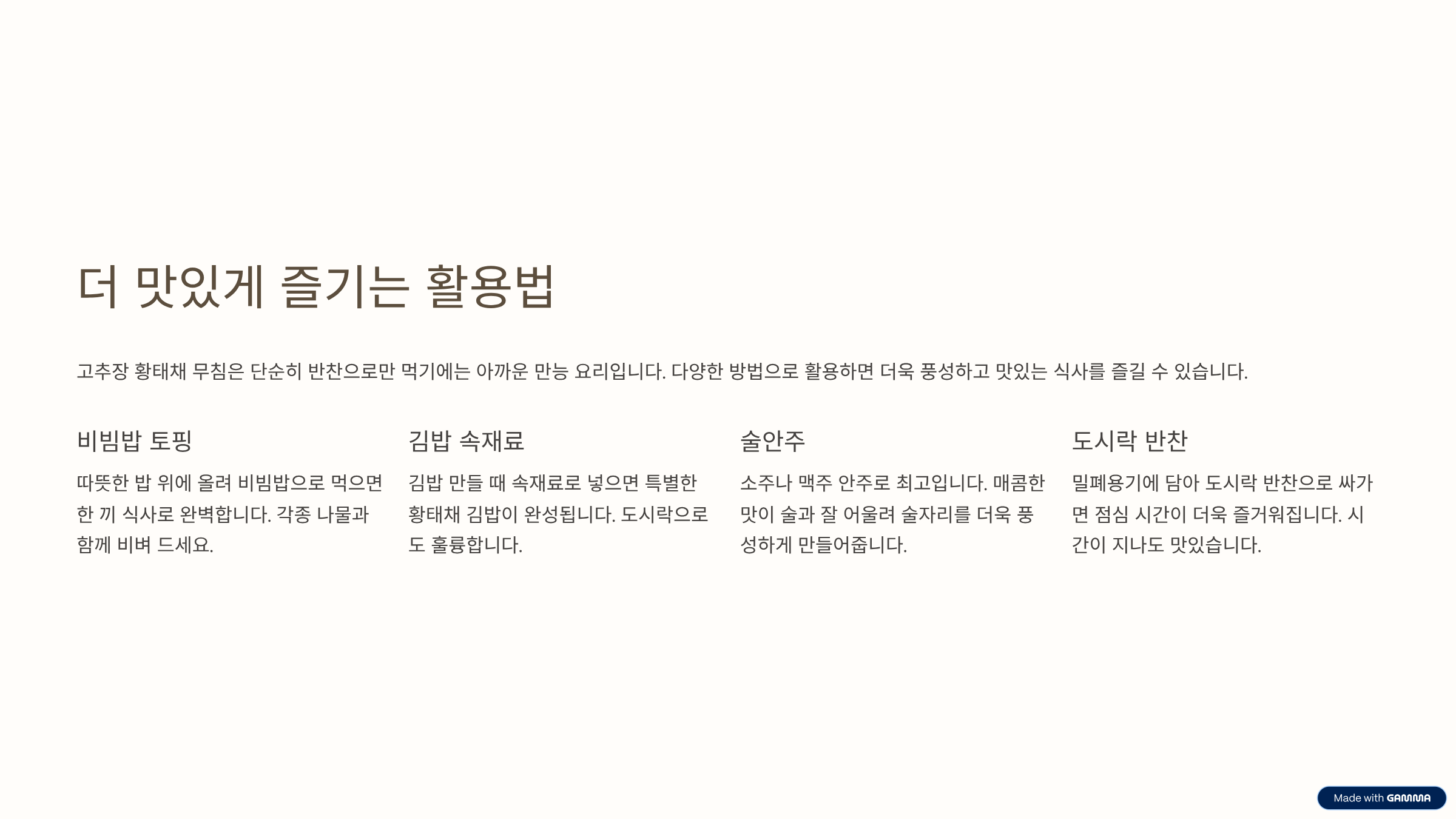 - **황태채 김밥:** 잘게 썬 무침을 밥과 함께 김에 말아 만듭니다.
