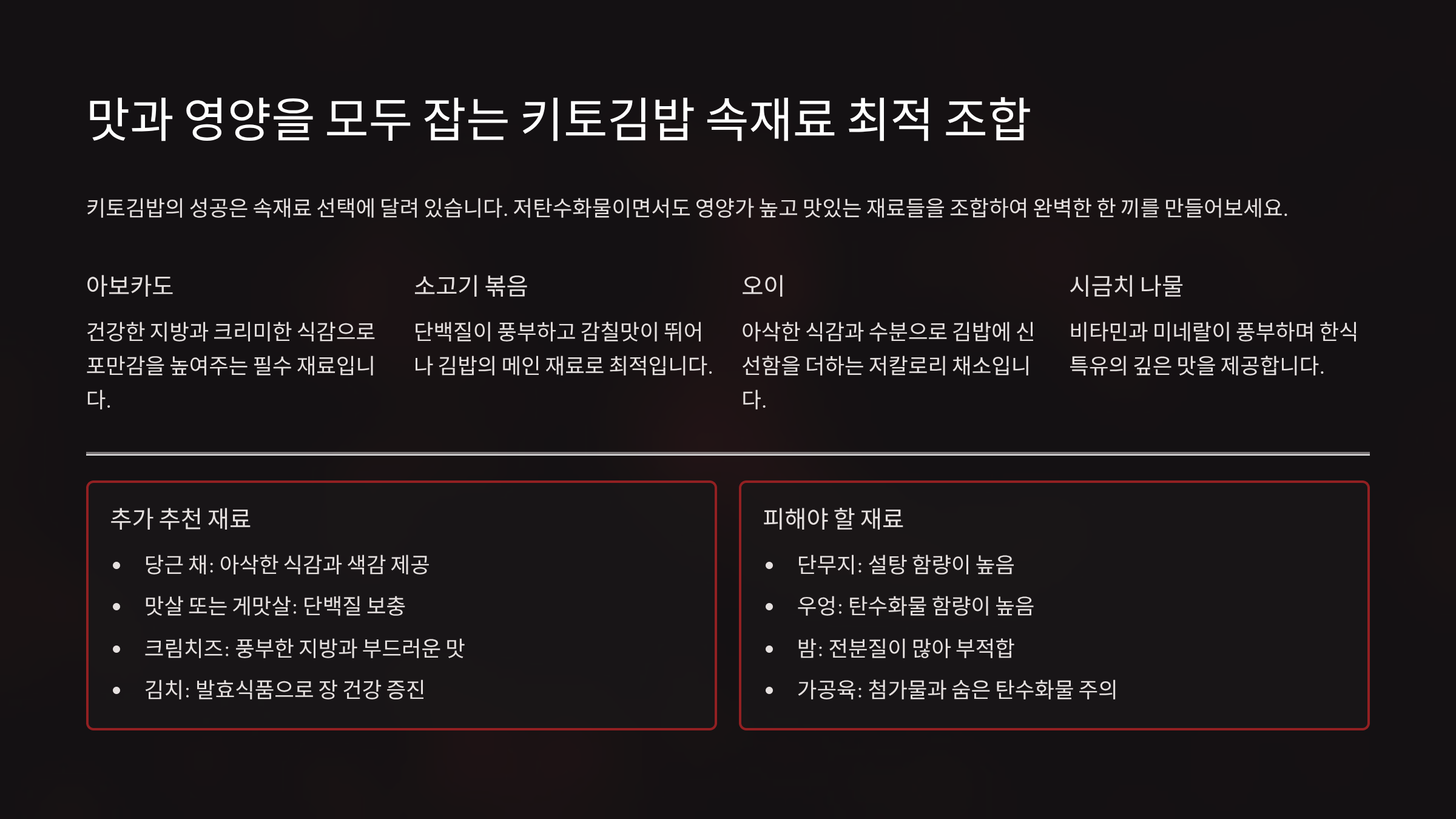 3. 맛과 영양을 모두 잡는 키토김밥 속재료 최적 조합 🌱